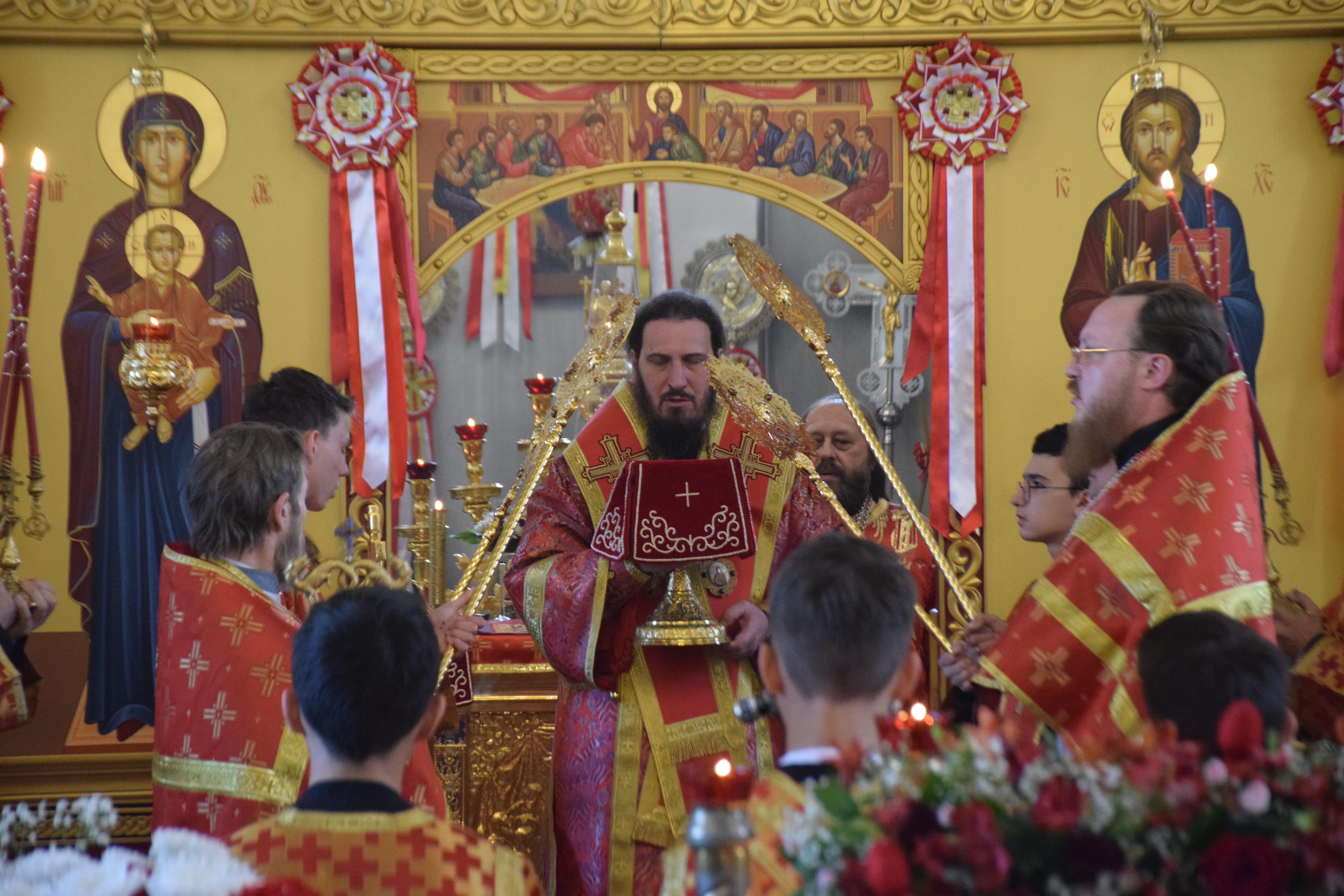 В день престольного праздника Преосвященный архиепископ Абаканский и Хакасский Ионафан, викарий Кызыльской епархии Преосвященный епископ Туранский Ермоген и Преосвященный епископ Минусинский и Курагинский Серафим возглавили совершение Божественной Литургии.