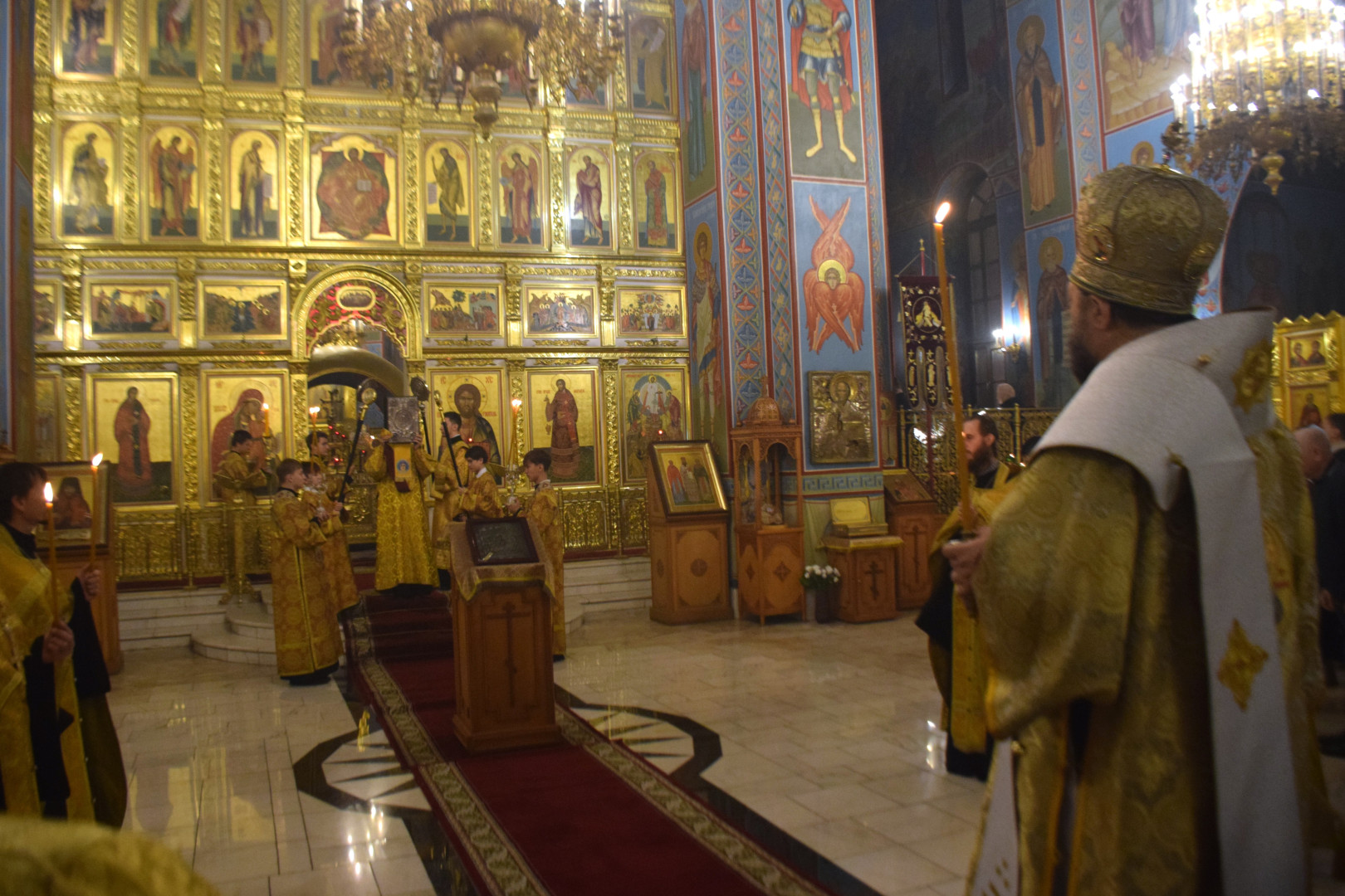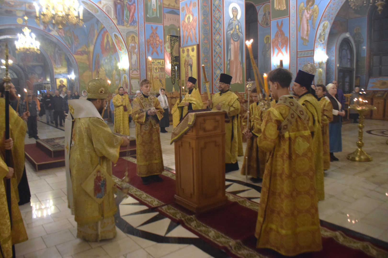 1 ноября 2025 года, накануне Недели 21-й по Пятидесятнице и дня памяти святого великомученика Артемия, в Спасо-Преображенском кафедральном соборе столицы Хакасии было совершено праздничное Всенощное бдение с литией и освящением хлебов.