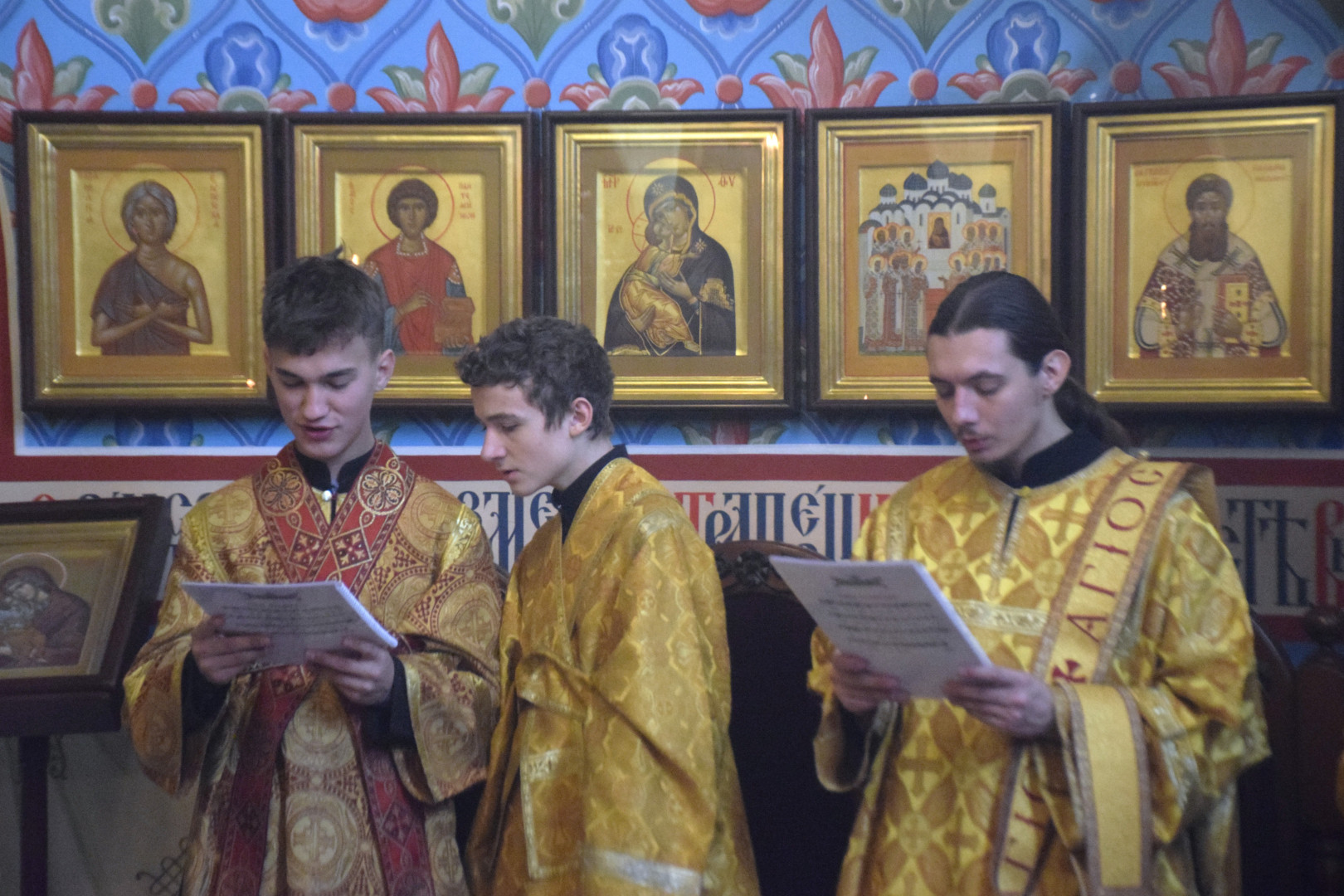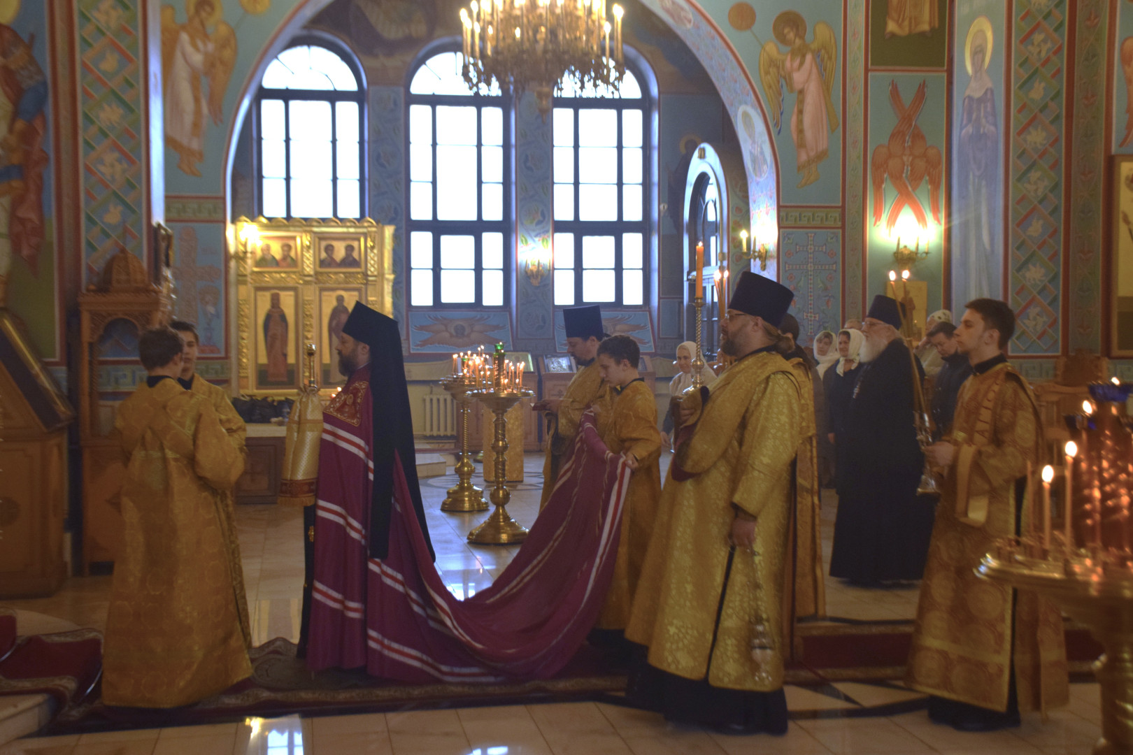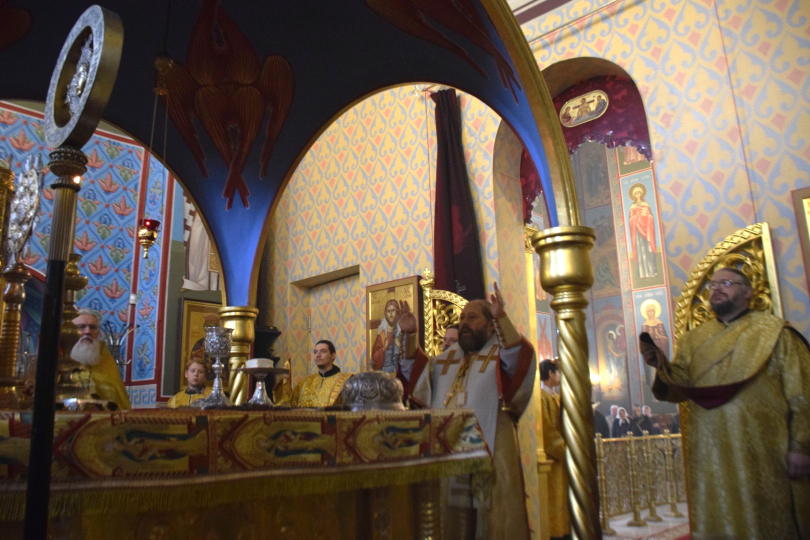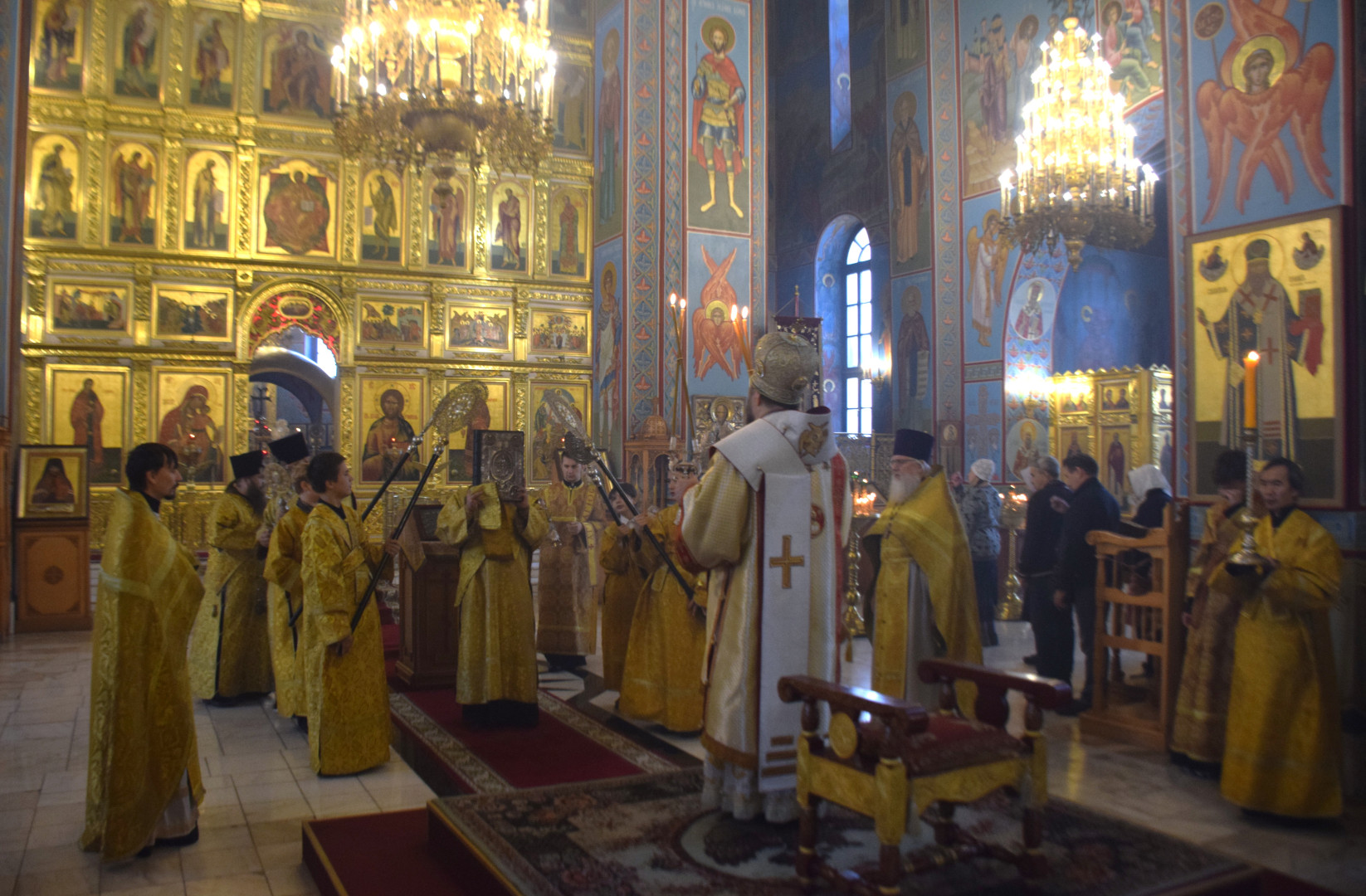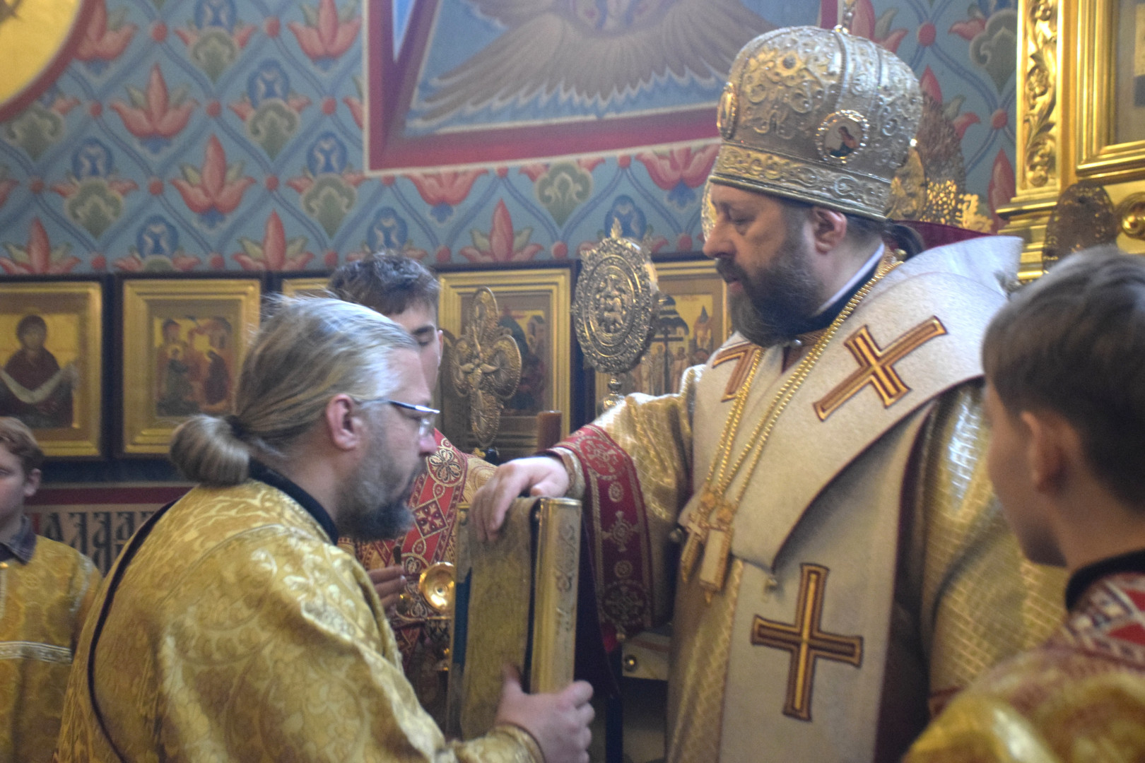 ВВладыке сослужили протоиерей Олег Попов и священник Евгений Девятов. Диаконский чин составили протодиакон Андрей Ермаков, диаконы Сергий Симонов, Владислав Бойченко, Михаил Луцик и иеродиакон Нестор (Рыбин). Песнопения Литургии исполнила группа архиерейского хора под управлением Марии Ермаковой.