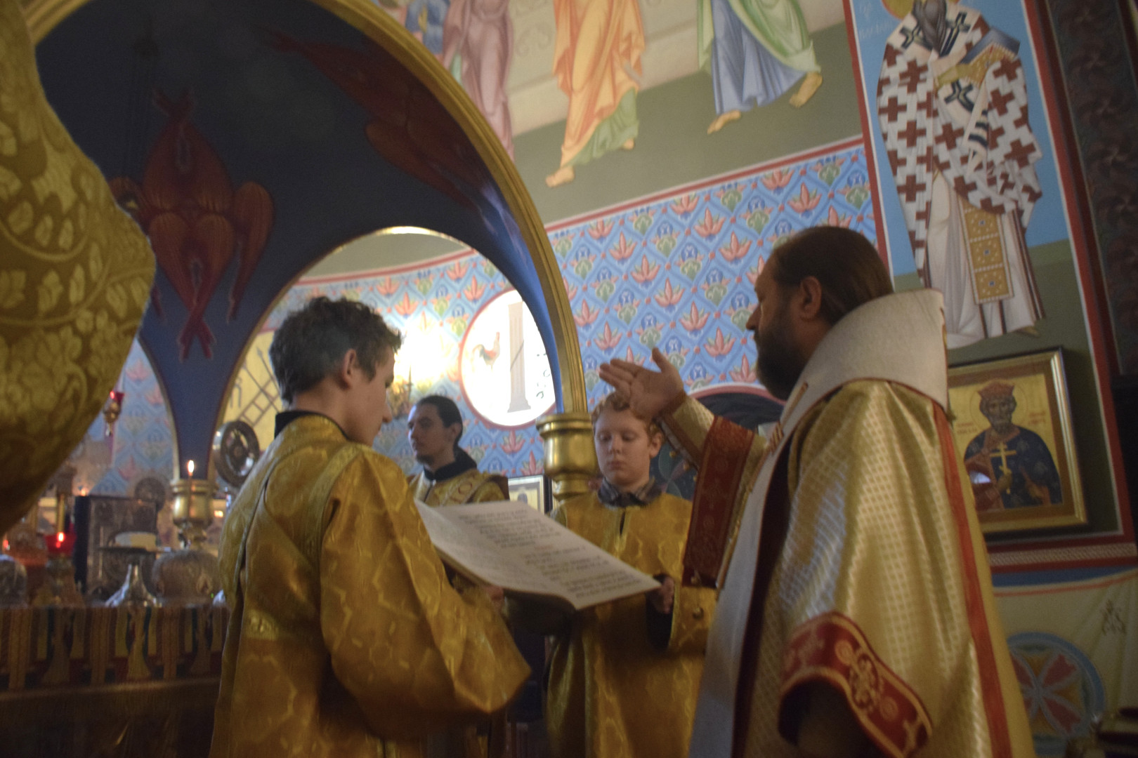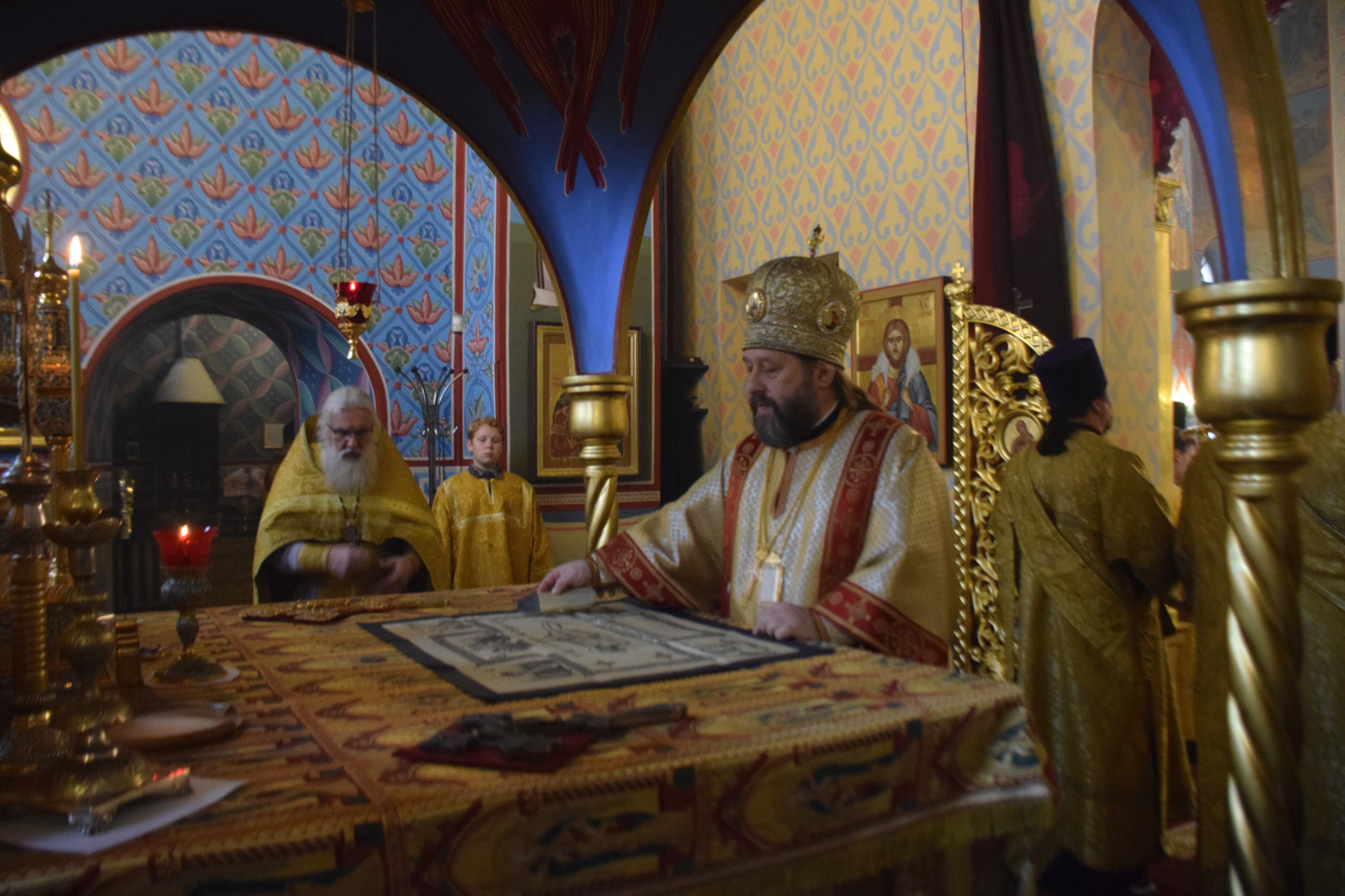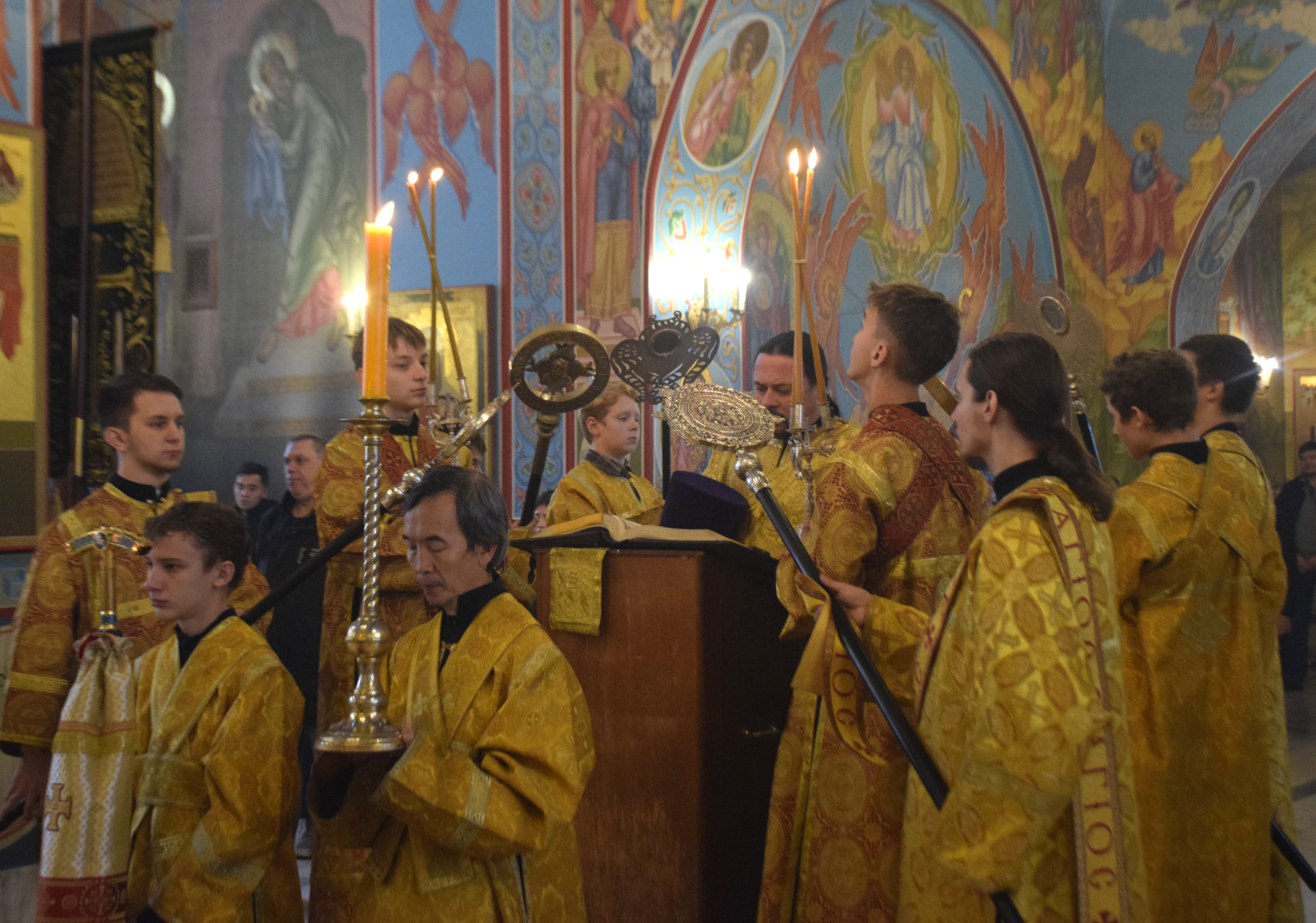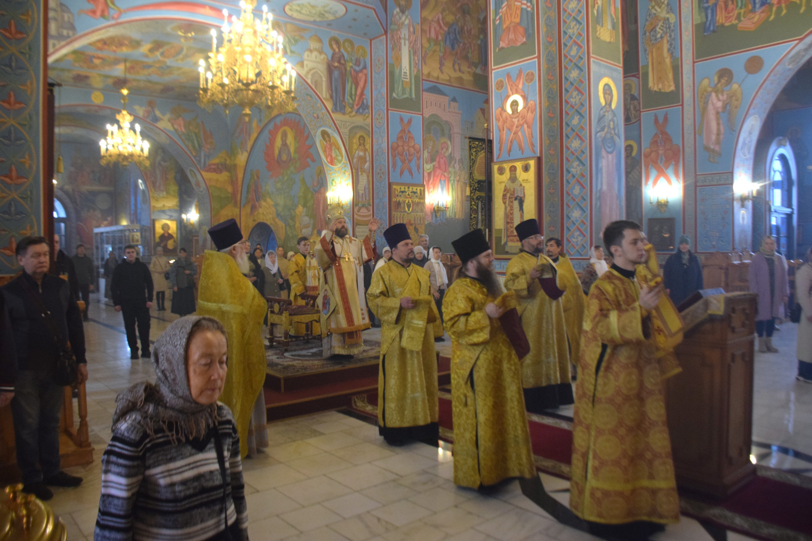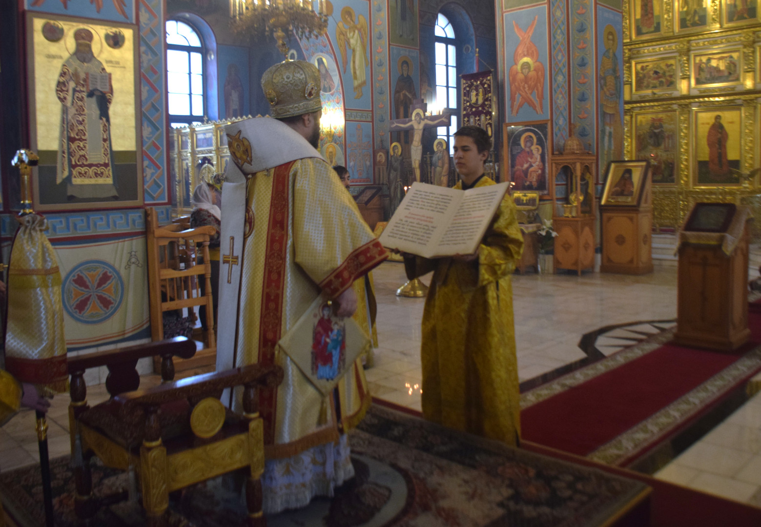 ВВладыке сослужили протоиерей Олег Попов и священник Евгений Девятов. Диаконский чин составили протодиакон Андрей Ермаков, диаконы Сергий Симонов, Владислав Бойченко, Михаил Луцик и иеродиакон Нестор (Рыбин). Песнопения Литургии исполнила группа архиерейского хора под управлением Марии Ермаковой.