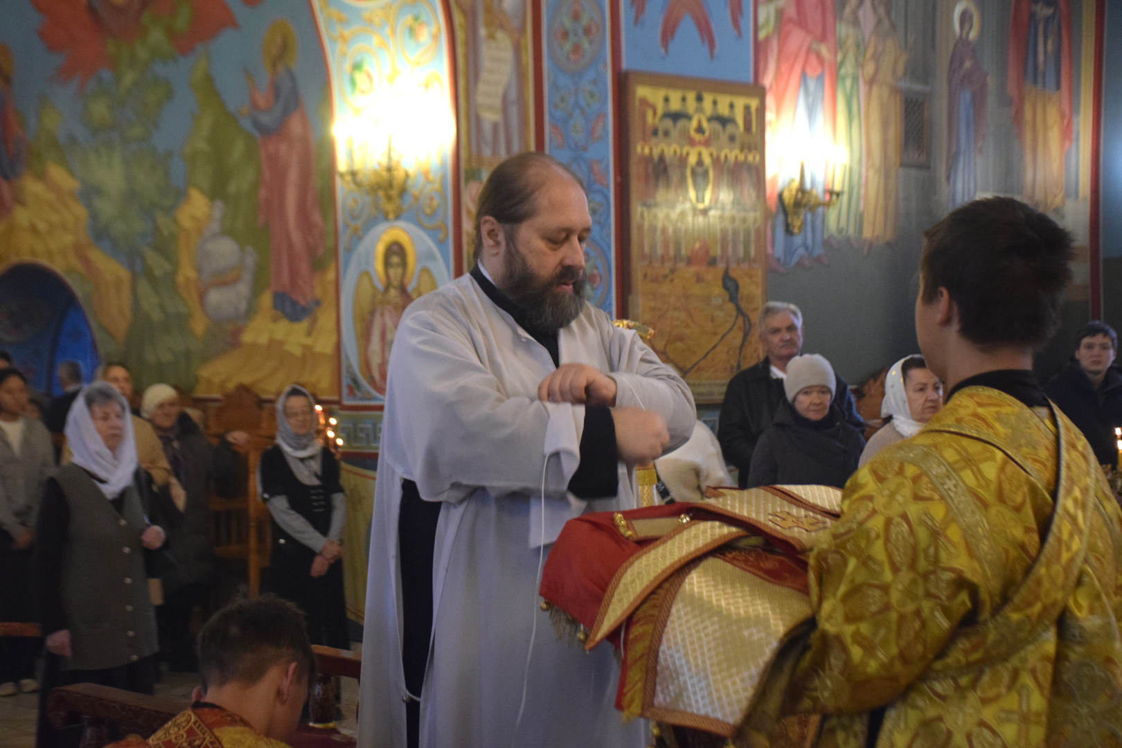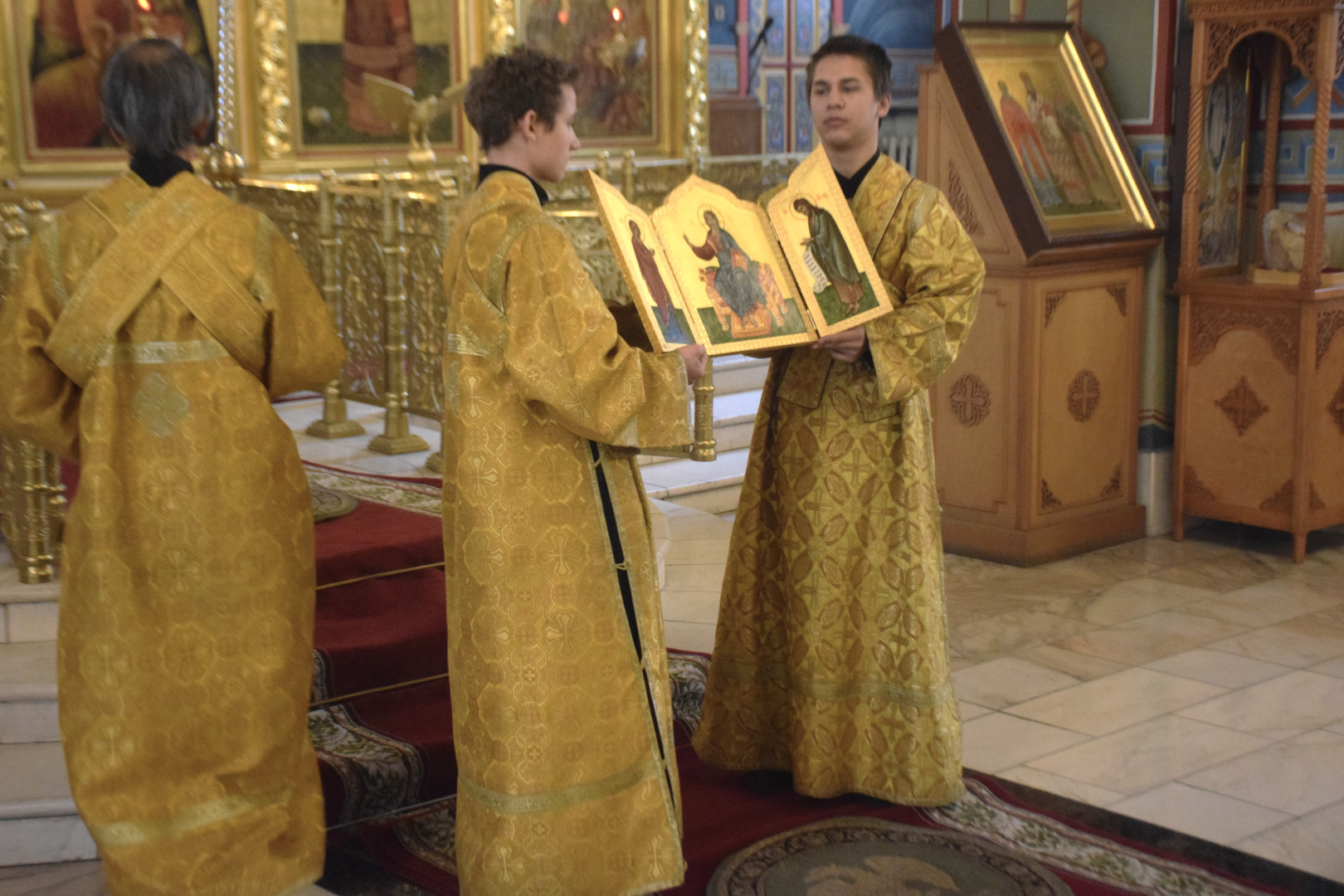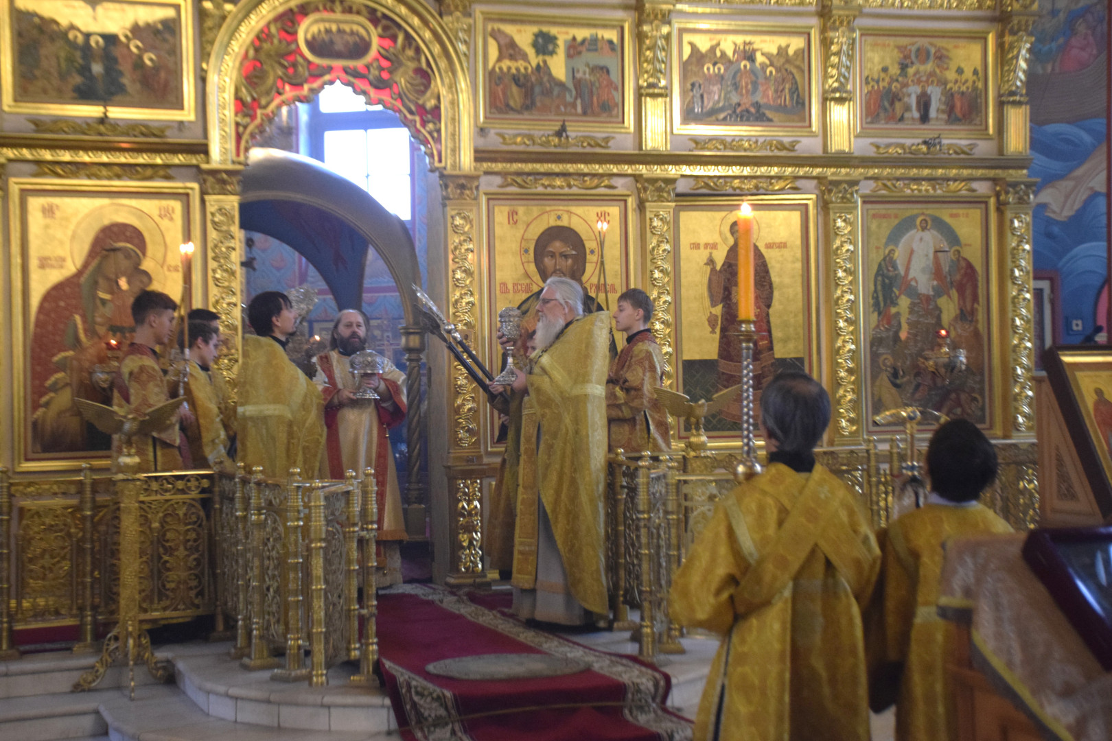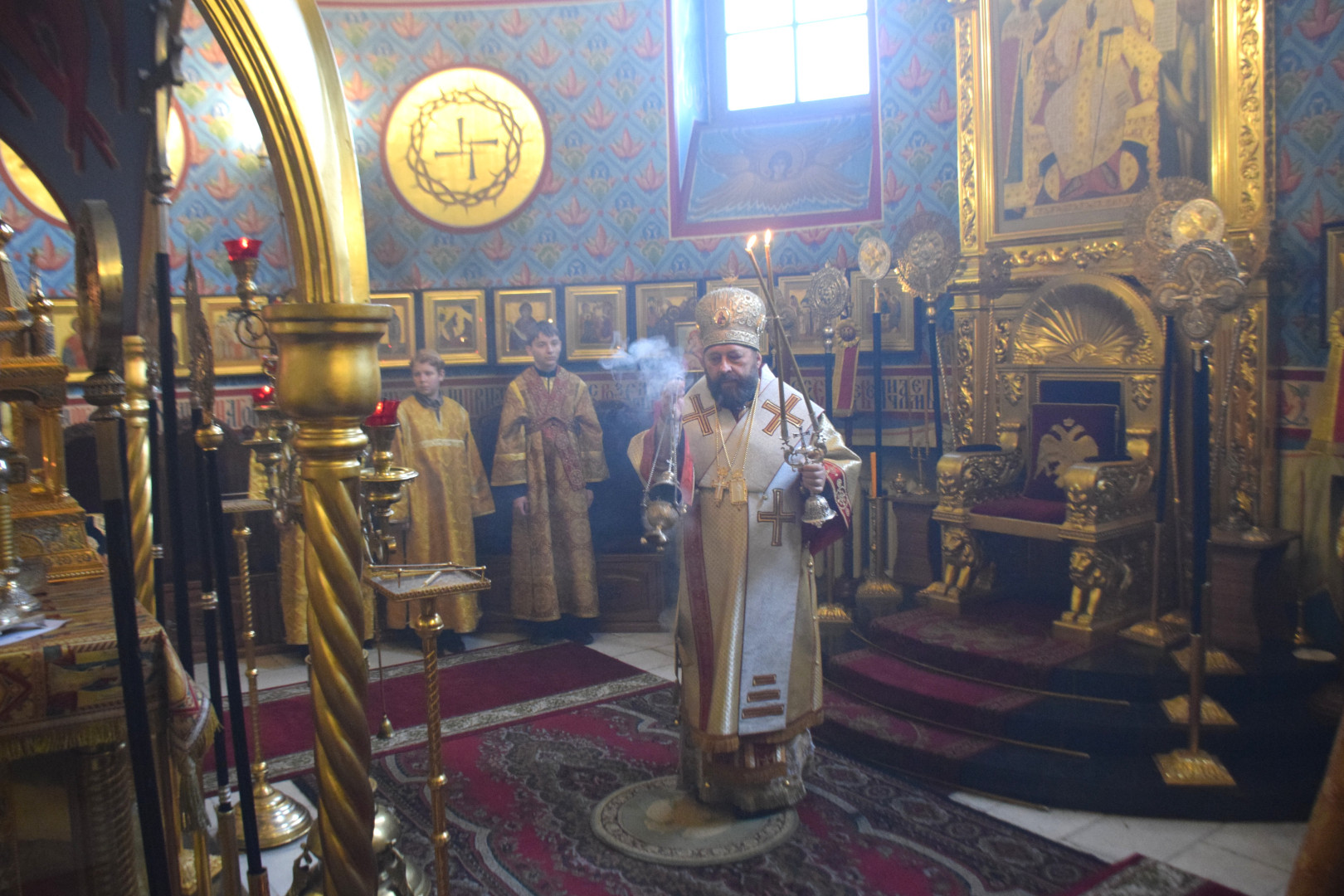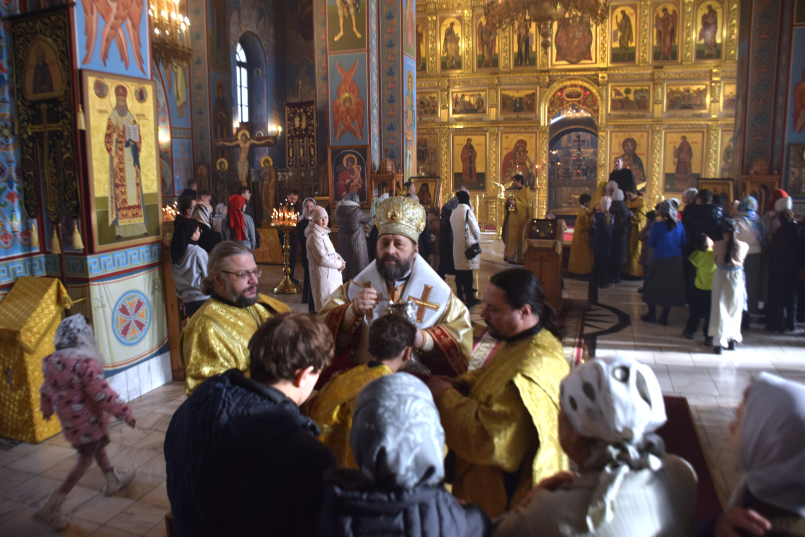 ВВладыке сослужили протоиерей Олег Попов и священник Евгений Девятов. Диаконский чин составили протодиакон Андрей Ермаков, диаконы Сергий Симонов, Владислав Бойченко, Михаил Луцик и иеродиакон Нестор (Рыбин). Песнопения Литургии исполнила группа архиерейского хора под управлением Марии Ермаковой.
