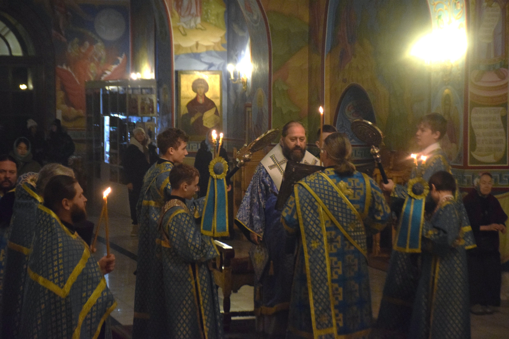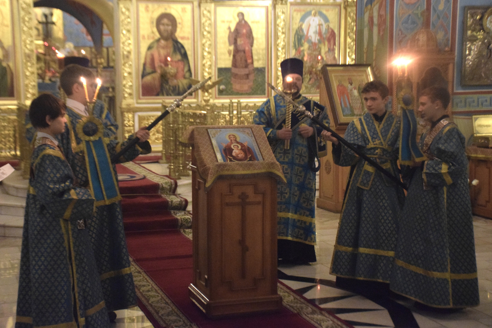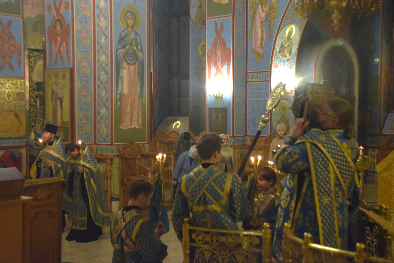 На полиелее прозвучало величание Божией Матери: «Достойно есть величати Тя, Богородице, Честнейшую Херувим и Славнейшую без сравнения Серафим».