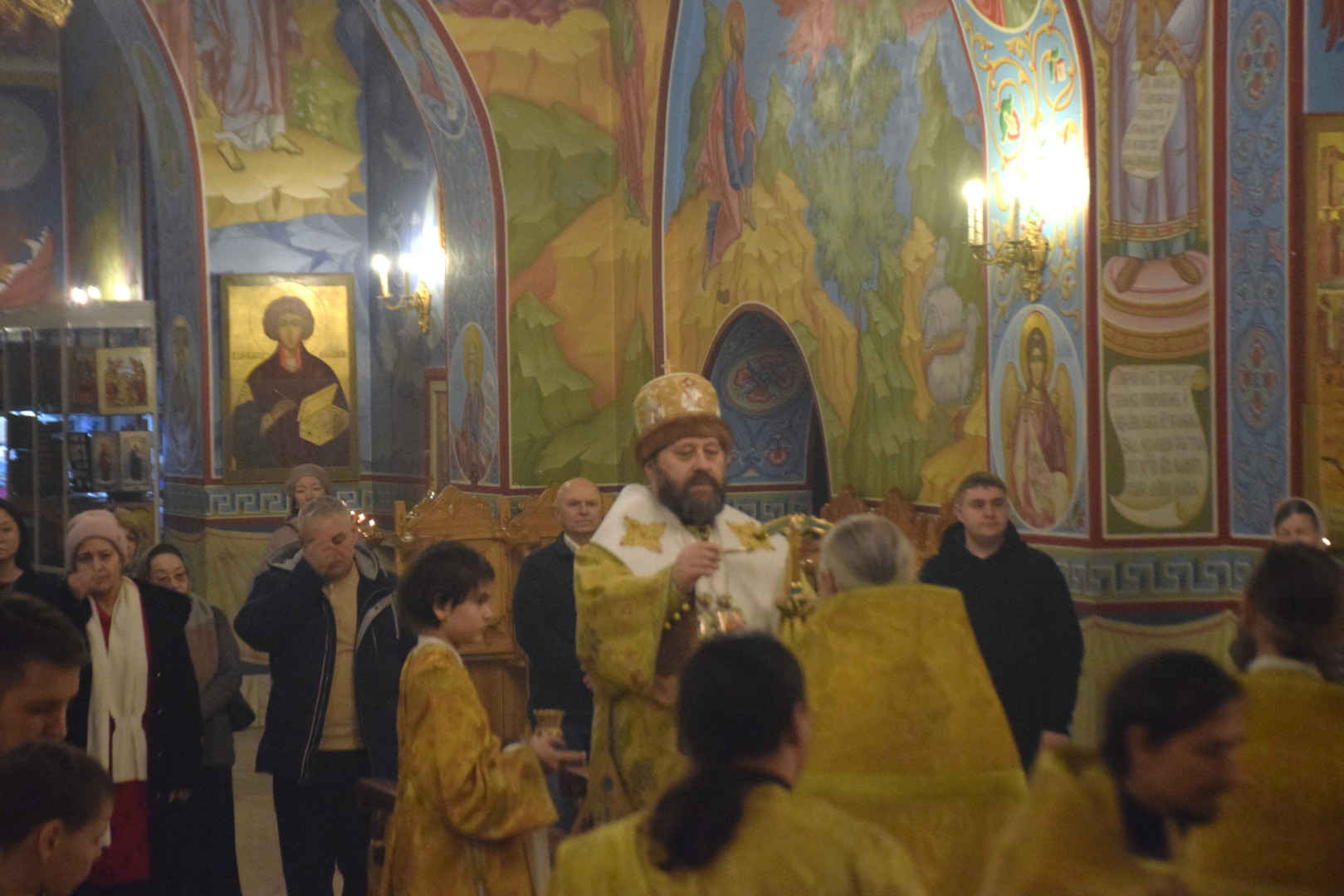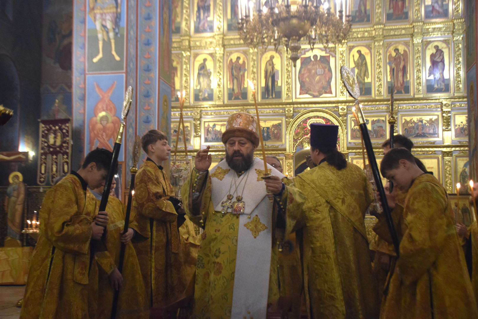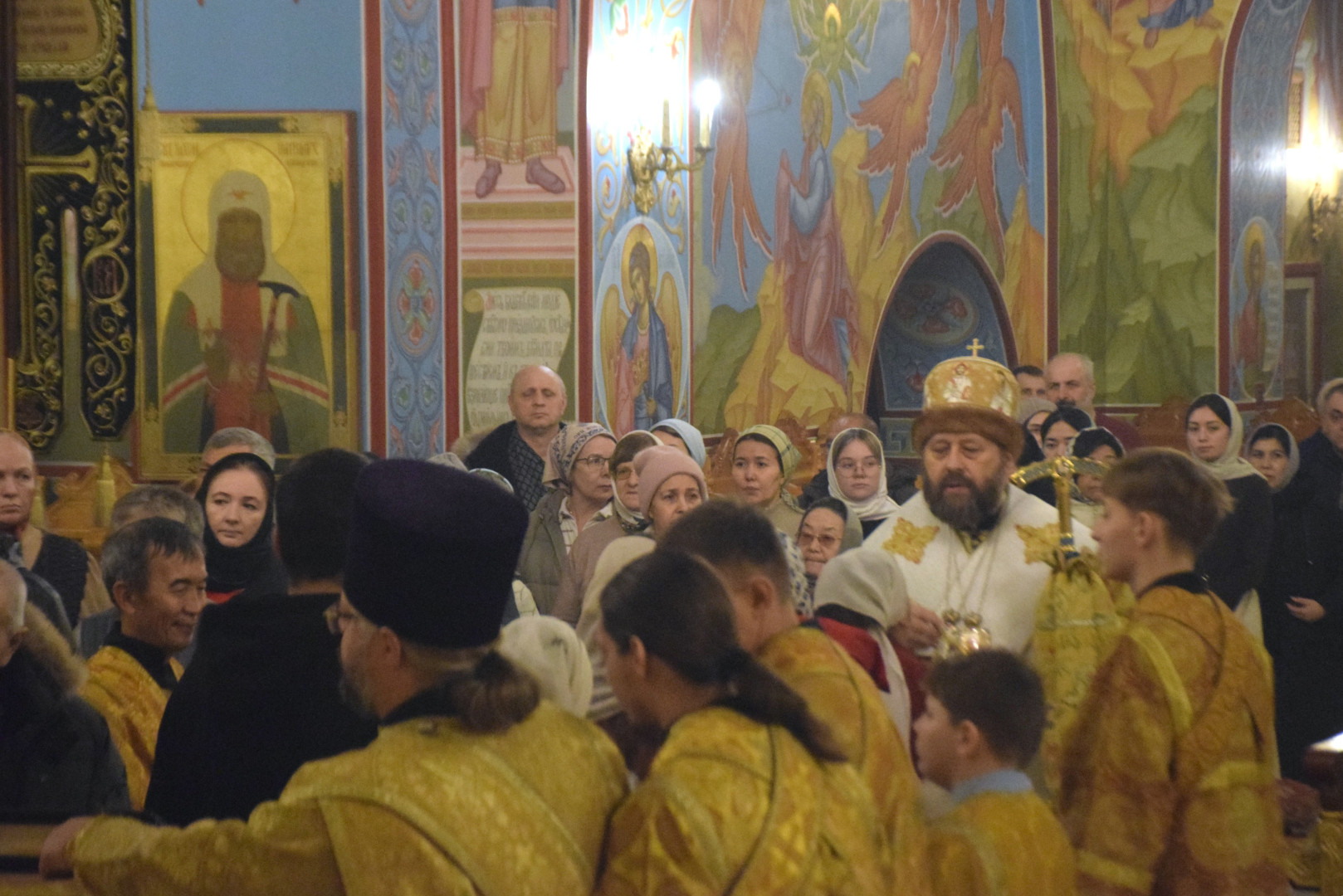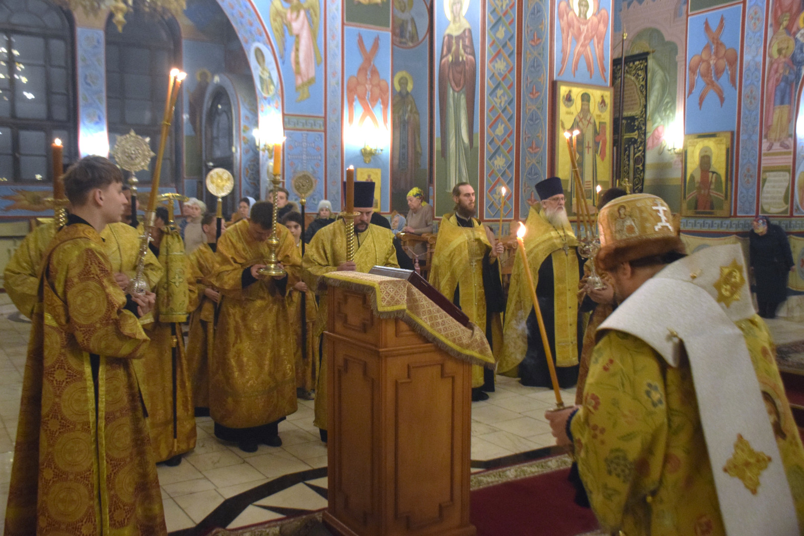 14 декабря 2025 года, накануне Недели 27-й по Пятидесятнице, дня памяти святого пророка Наума и праведного Филарета Милостивого, Преосвященный архиепископ Абаканский и Хакасский Ионафан в сослужении соборных клириков совершил Всенощное бдение с литией и освящением хлебов в Спасо-Преображенском соборе столицы Хакасии.