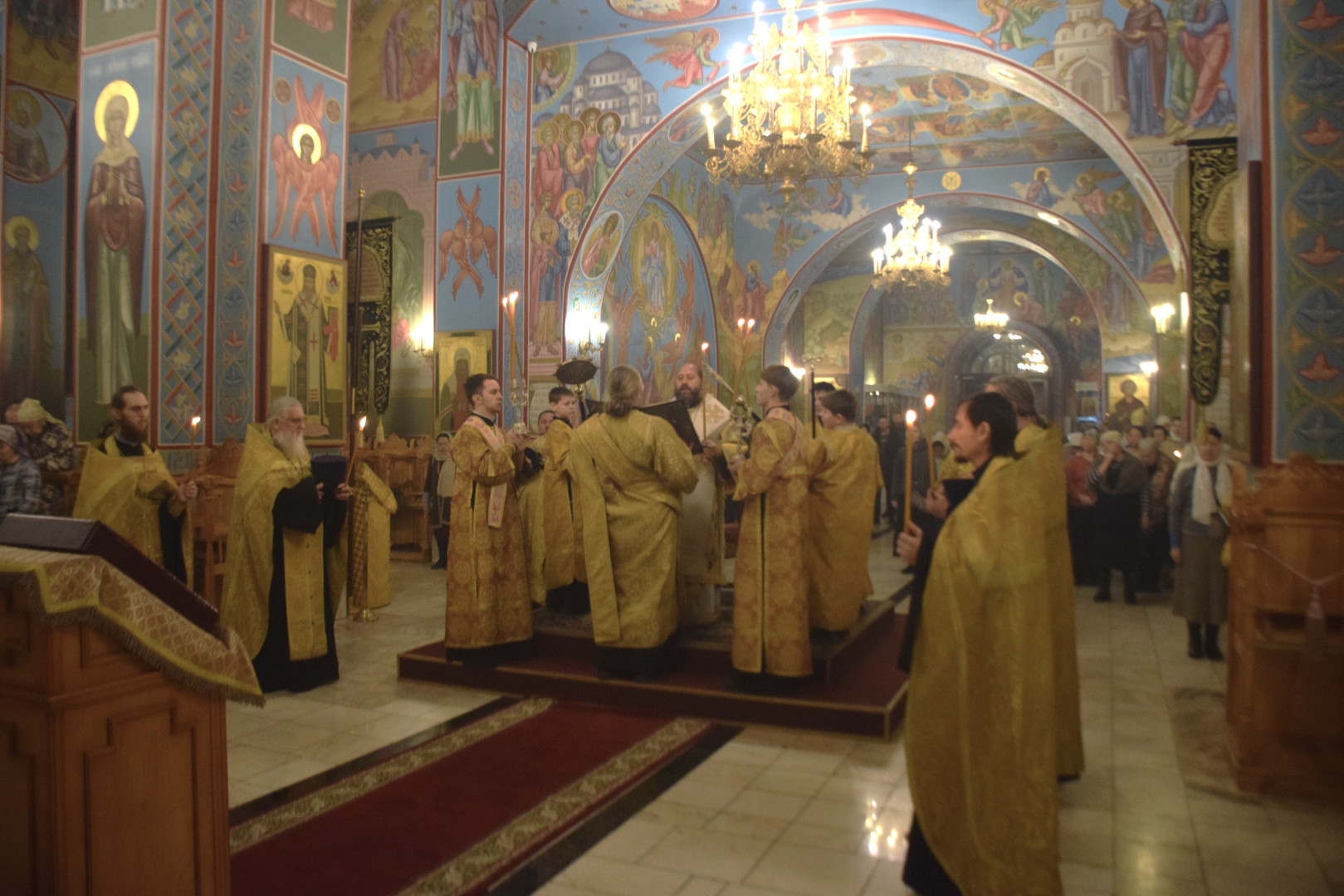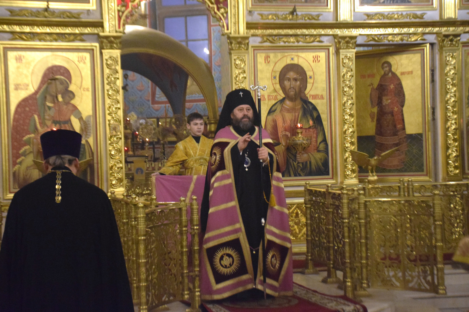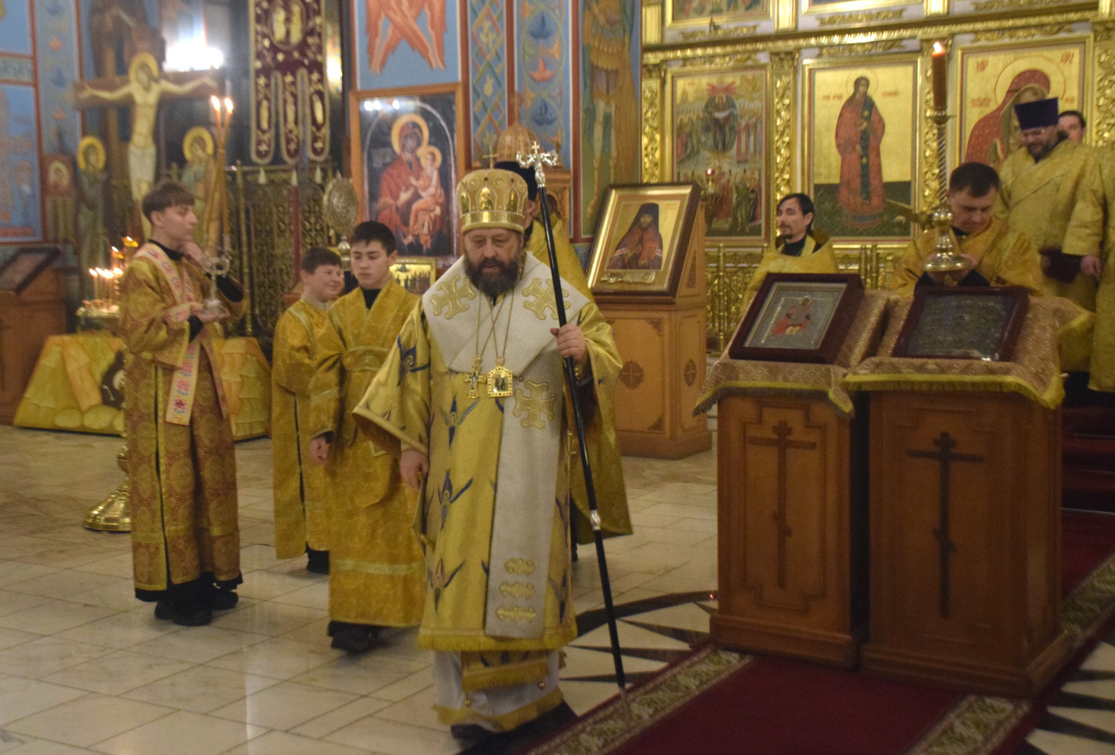 27 декабря 2025 года, накануне Недели 29-й по Пятидесятнице, святых праотец, Преосвященный архиепископ Абаканский и Хакасский Ионафан в сослужении протоиереев Олега Попова, Димитрия Ляпустина, священников Николай Пугина и Евгения Девятова при диаконском служении протодиакона Андрея Ермакова, диаконов Сергия Симонова, Владислава Бойченко и иеродиакона Нестора (Рыбина) совершил Всенощное бдение с литией и освящением хлебов в Спасо-Преображенском соборе г. Абакана.
