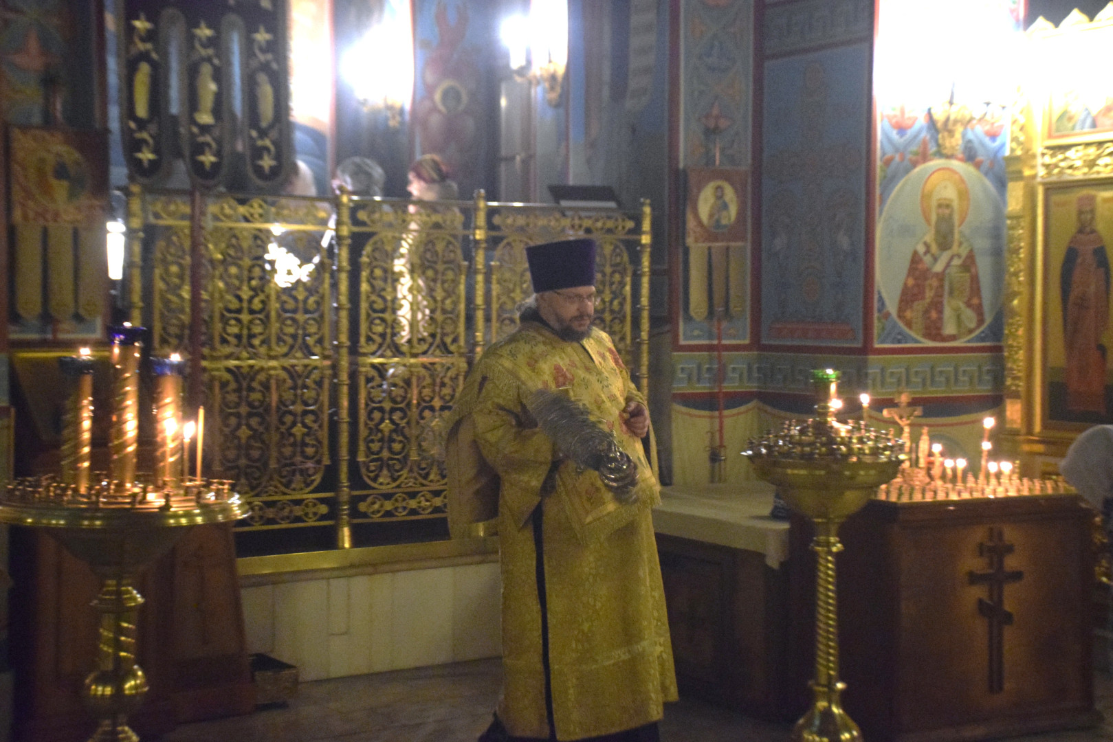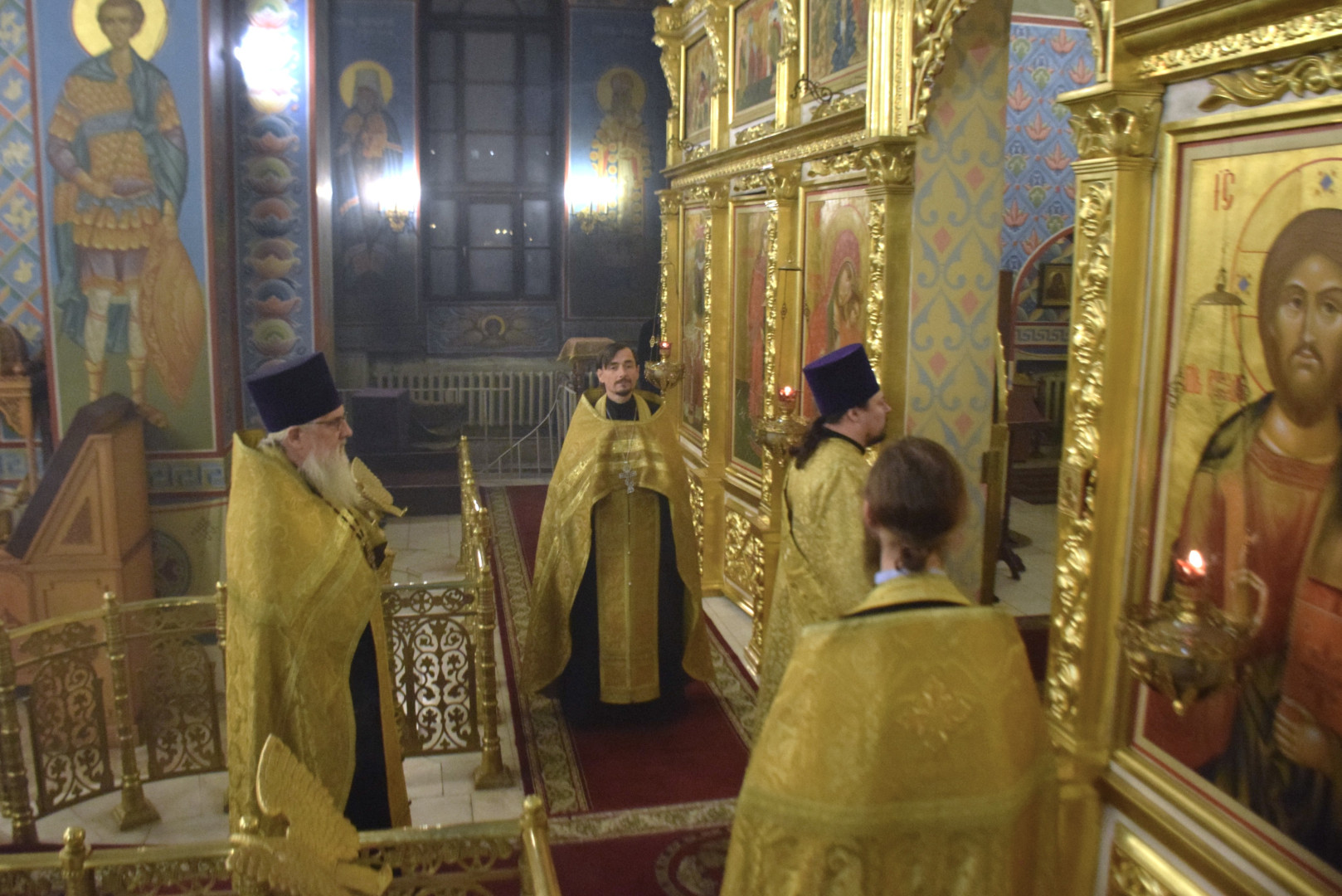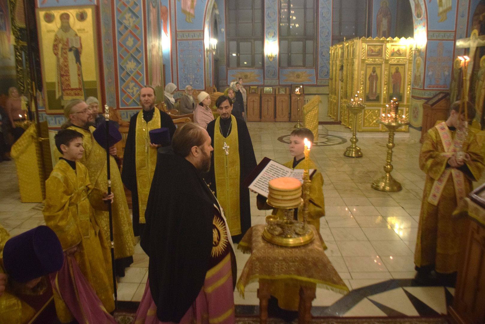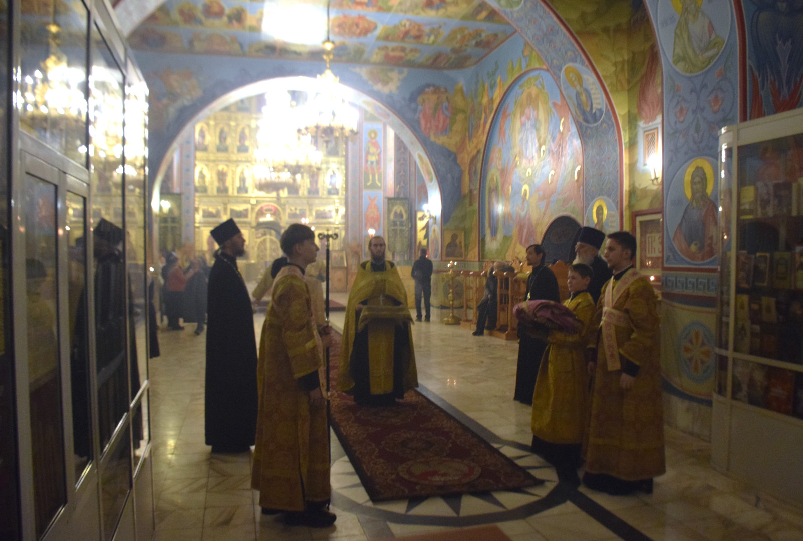 27 декабря 2025 года, накануне Недели 29-й по Пятидесятнице, святых праотец, Преосвященный архиепископ Абаканский и Хакасский Ионафан в сослужении протоиереев Олега Попова, Димитрия Ляпустина, священников Николай Пугина и Евгения Девятова при диаконском служении протодиакона Андрея Ермакова, диаконов Сергия Симонова, Владислава Бойченко и иеродиакона Нестора (Рыбина) совершил Всенощное бдение с литией и освящением хлебов в Спасо-Преображенском соборе г. Абакана.