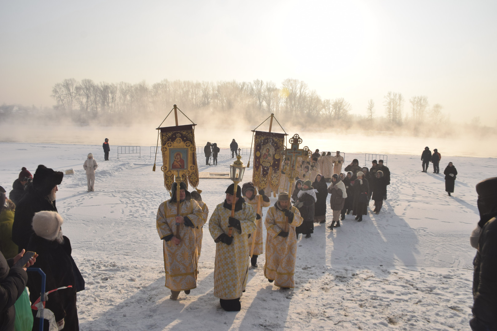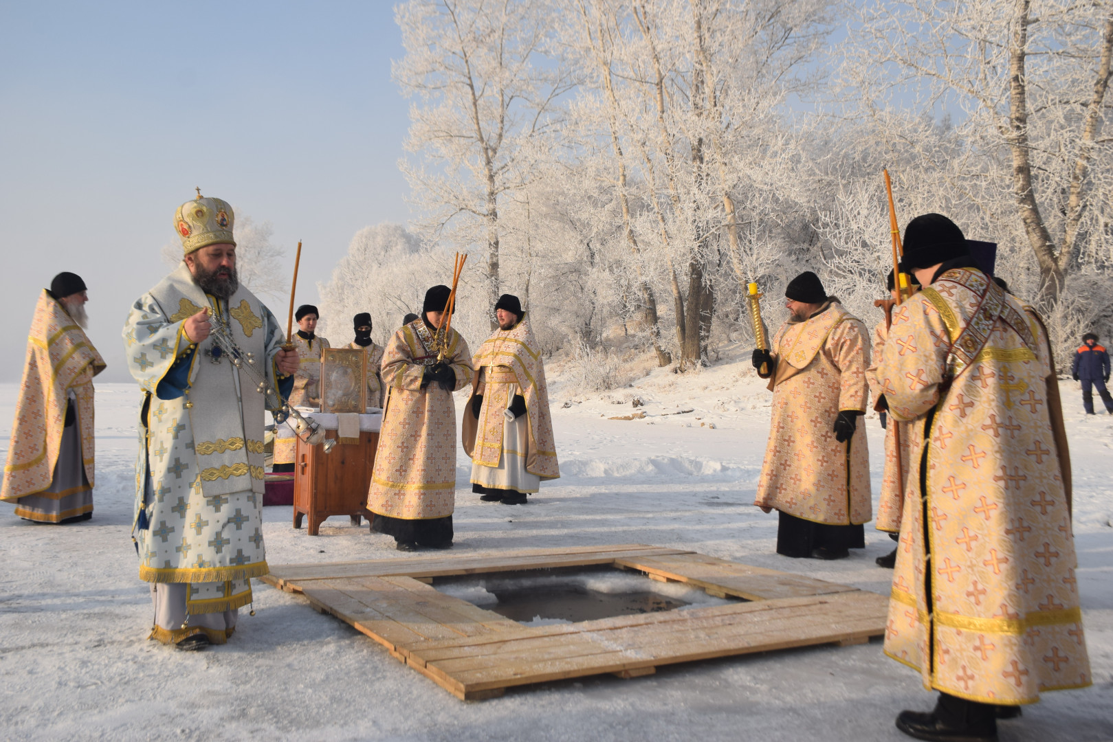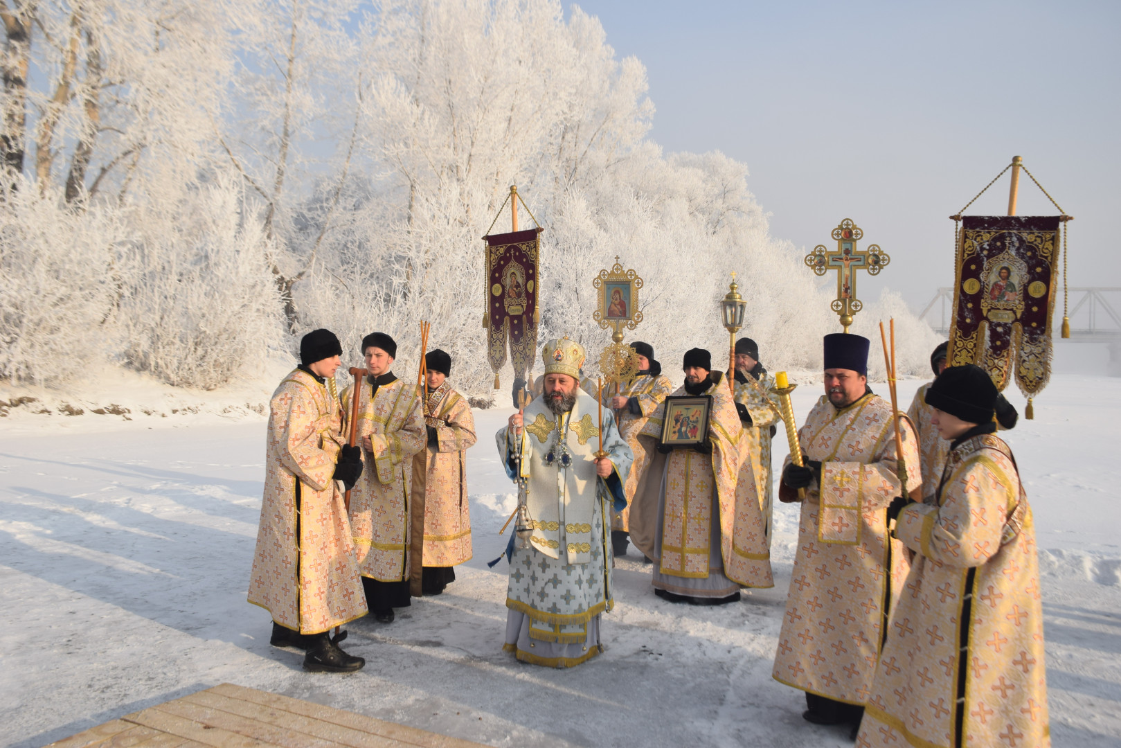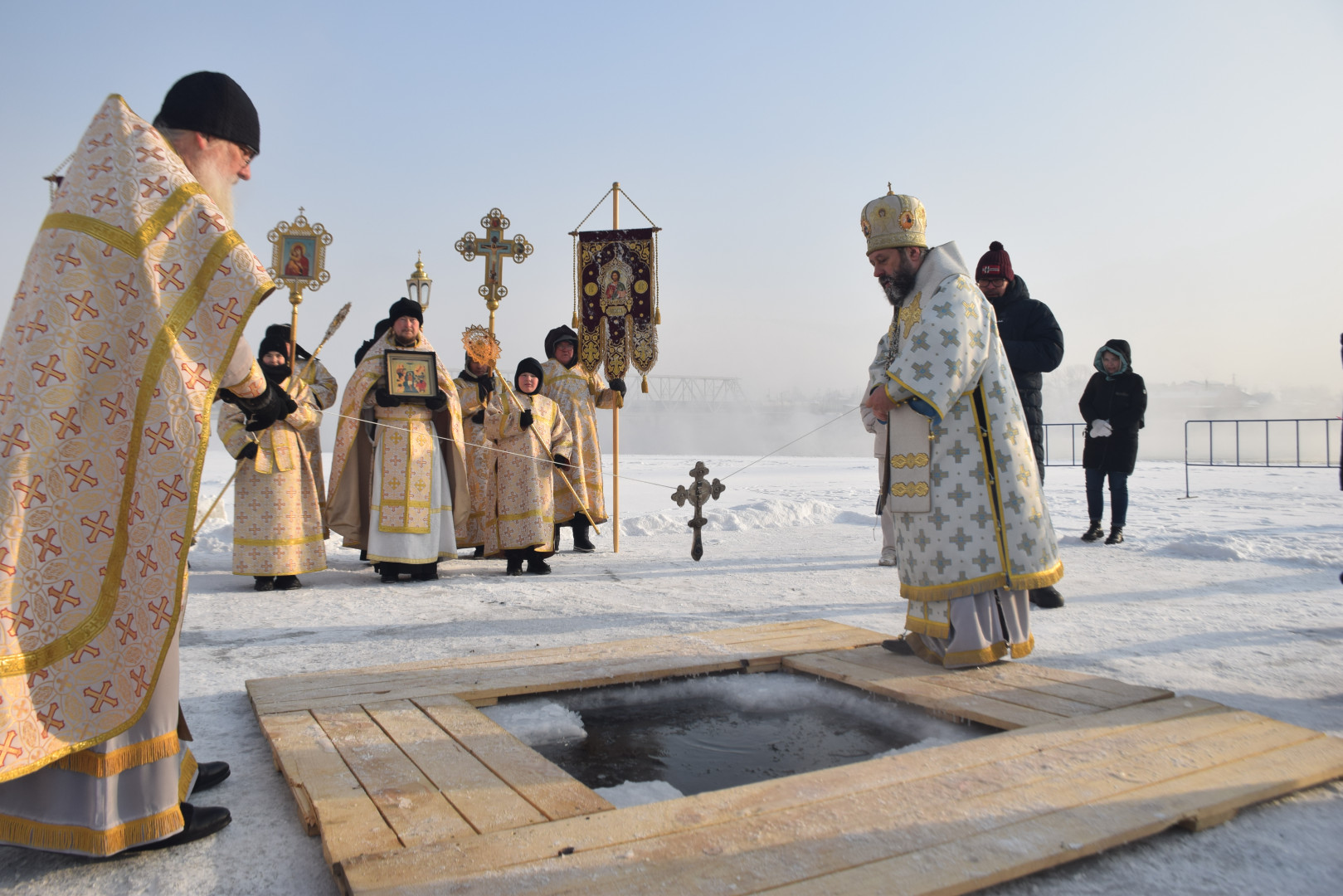 По заамвонной молитве архипастырь, духовенство и все молящиеся при пении стихир «Глас Господень на водах» направились крестным ходом на берег реки Абакан, где традиционно приготавливается крестообразная прорубь — Иордань. Здесь был совершен чин Великого освящения воды: вначале Владыка совершил троекратное каждение вокруг Иордани, были прочитаны паримии, Апостол и Евангелие, а затем протодиаконом была произнесена великая ектения с особыми прошениями об освящении вод. Архиереем была прочитана пространная молитва освящения, после чего в воды реки трижды при троекратном пении тропаря праздника «Во Иордане крещающуся Тебе, Господи» был погружен Честной Крест.