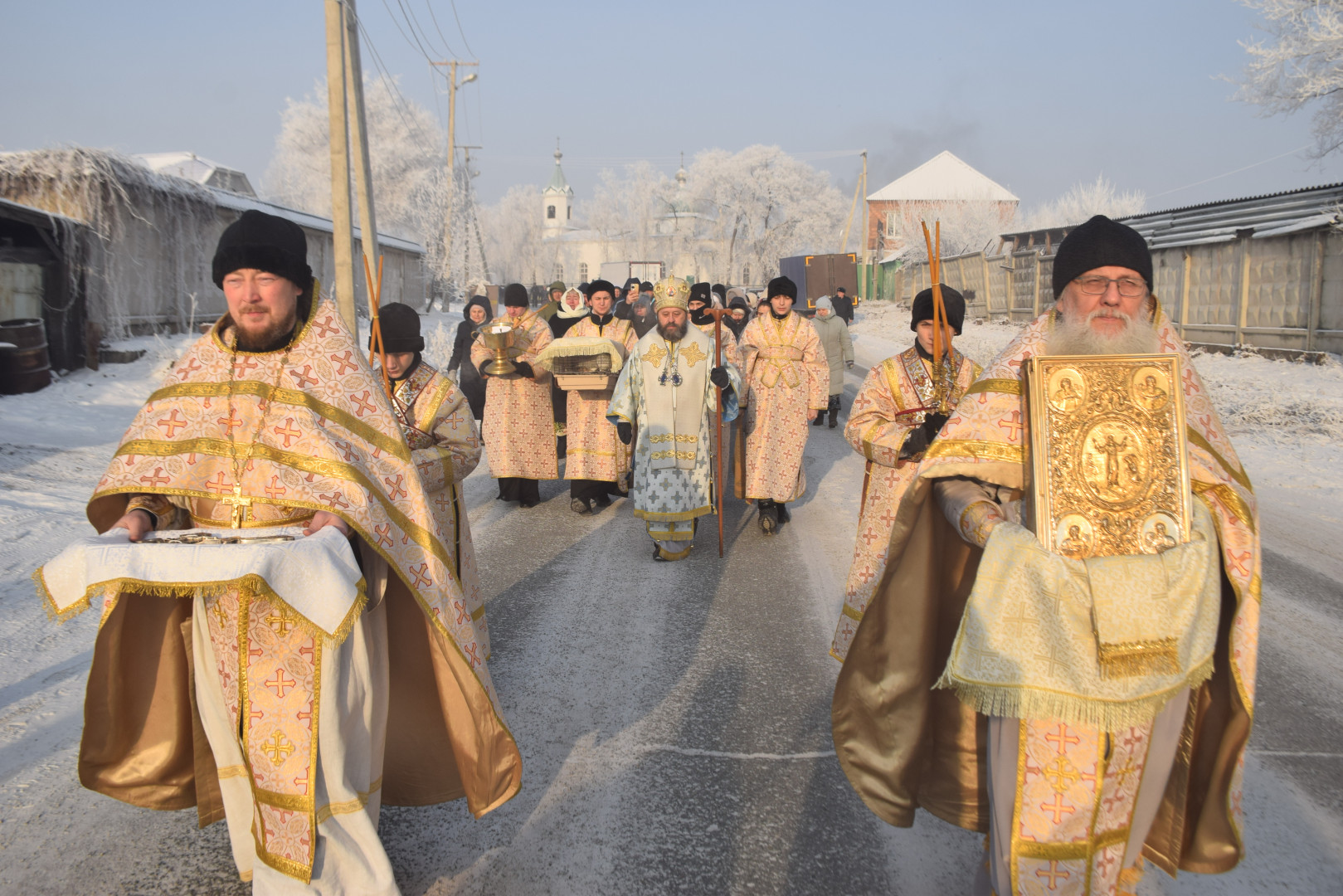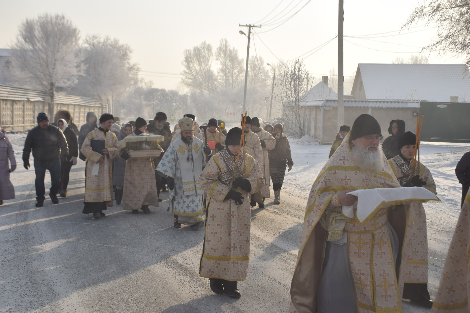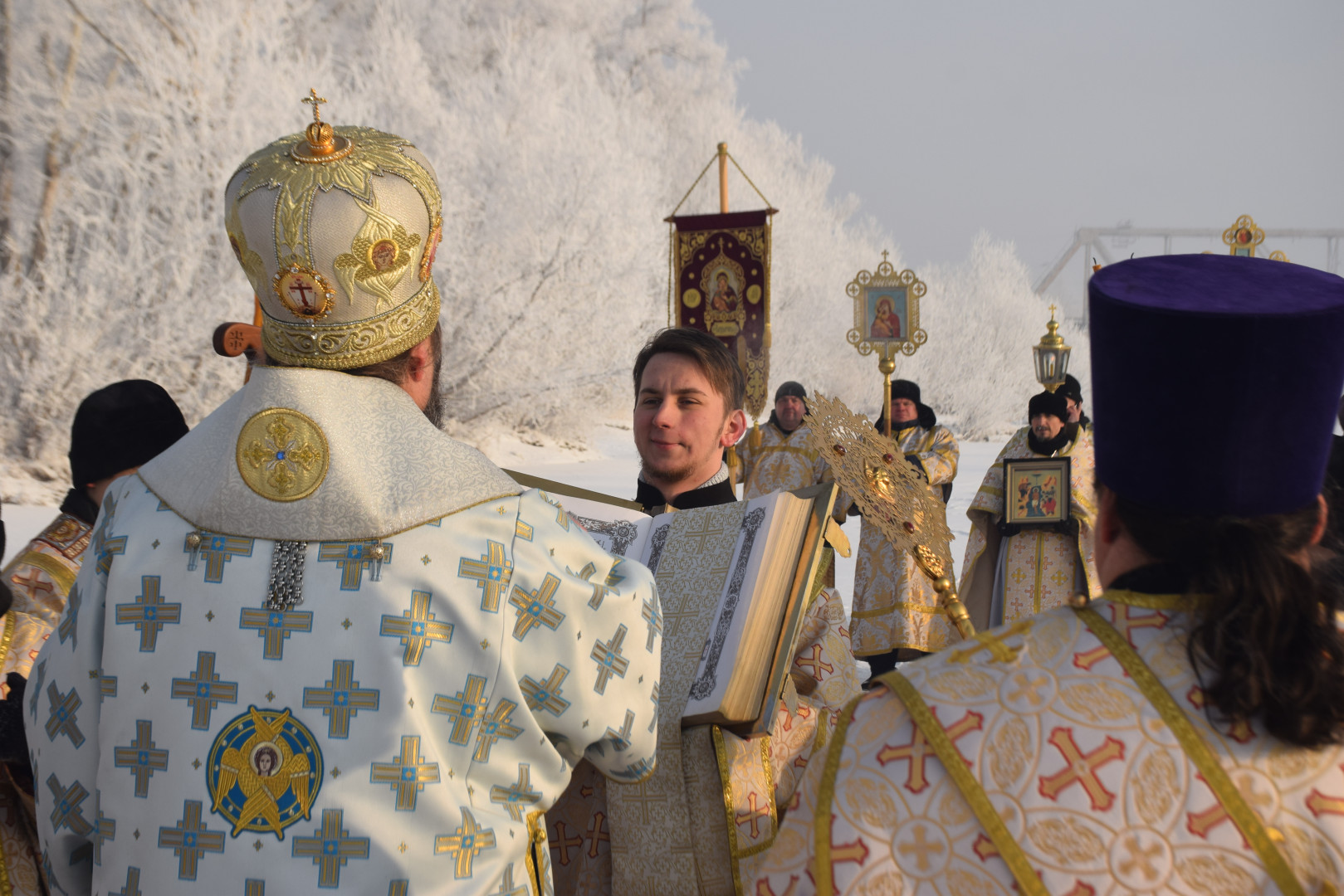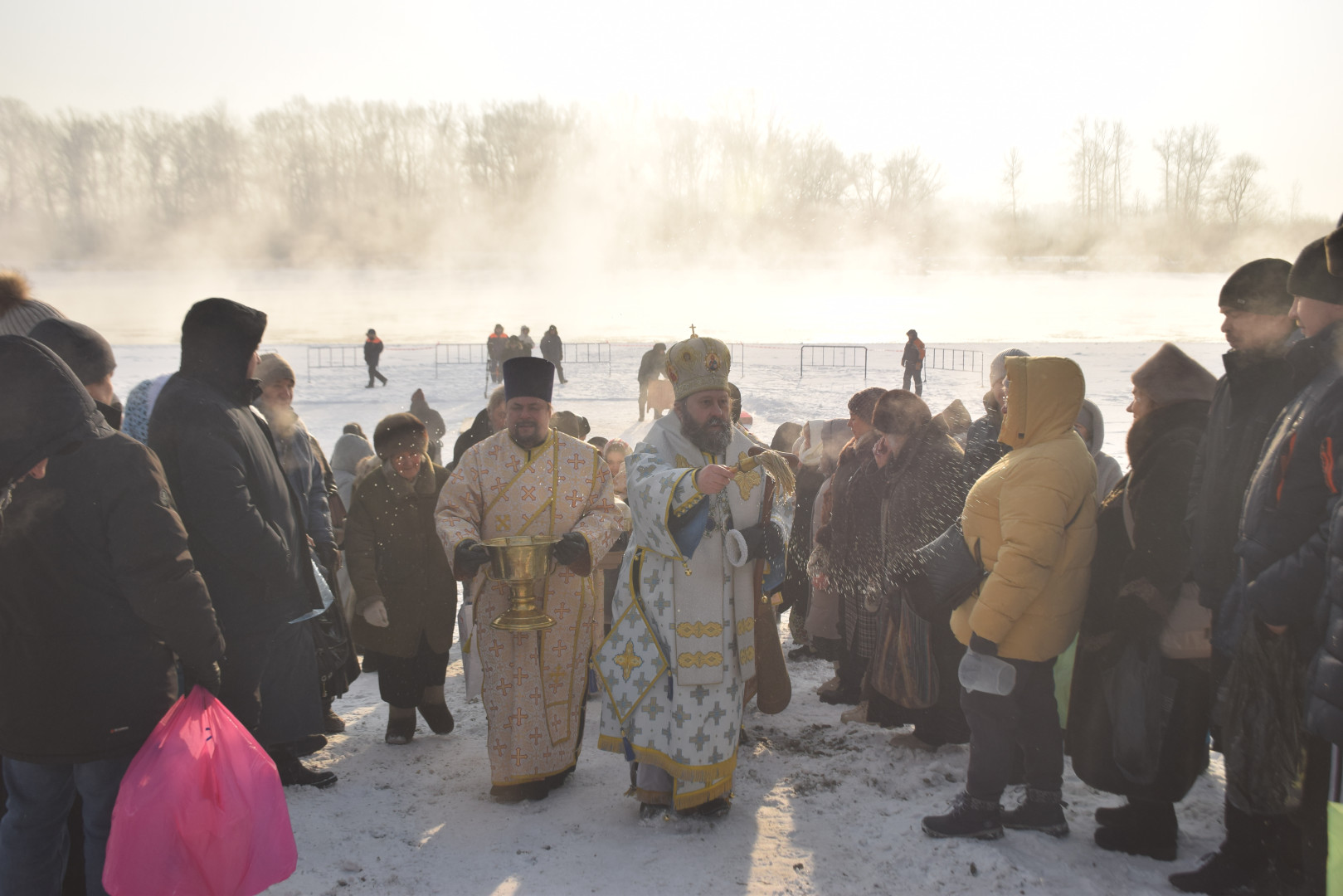 По заамвонной молитве архипастырь, духовенство и все молящиеся при пении стихир «Глас Господень на водах» направились крестным ходом на берег реки Абакан, где традиционно приготавливается крестообразная прорубь — Иордань. Здесь был совершен чин Великого освящения воды: вначале Владыка совершил троекратное каждение вокруг Иордани, были прочитаны паримии, Апостол и Евангелие, а затем протодиаконом была произнесена великая ектения с особыми прошениями об освящении вод. Архиереем была прочитана пространная молитва освящения, после чего в воды реки трижды при троекратном пении тропаря праздника «Во Иордане крещающуся Тебе, Господи» был погружен Честной Крест.