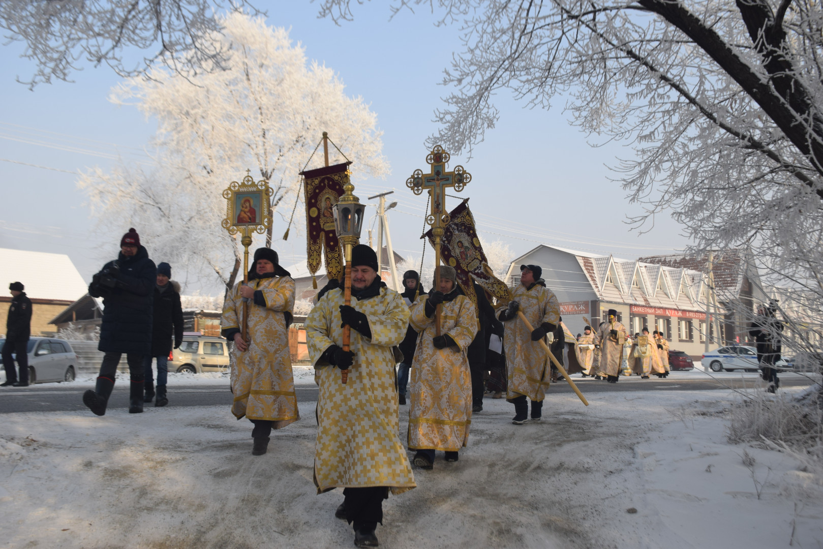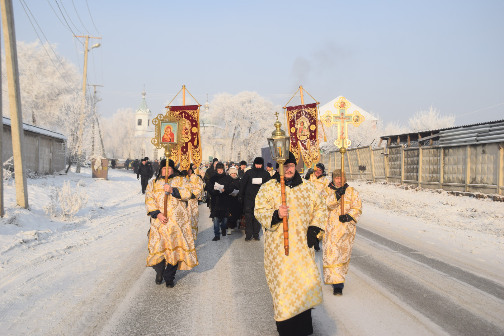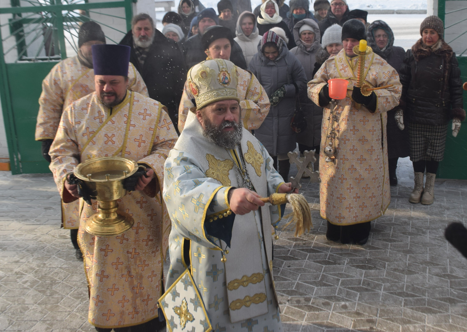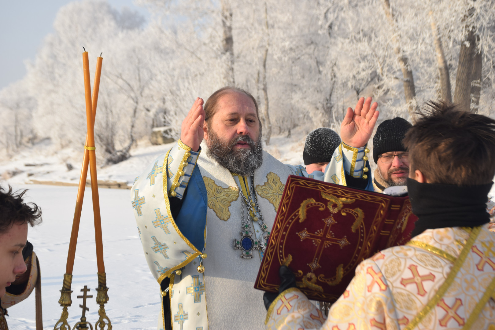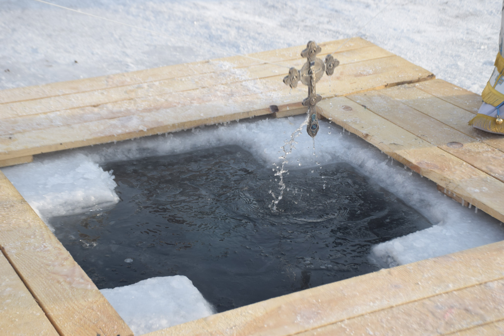 По заамвонной молитве архипастырь, духовенство и все молящиеся при пении стихир «Глас Господень на водах» направились крестным ходом на берег реки Абакан, где традиционно приготавливается крестообразная прорубь — Иордань. Здесь был совершен чин Великого освящения воды: вначале Владыка совершил троекратное каждение вокруг Иордани, были прочитаны паримии, Апостол и Евангелие, а затем протодиаконом была произнесена великая ектения с особыми прошениями об освящении вод. Архиереем была прочитана пространная молитва освящения, после чего в воды реки трижды при троекратном пении тропаря праздника «Во Иордане крещающуся Тебе, Господи» был погружен Честной Крест.