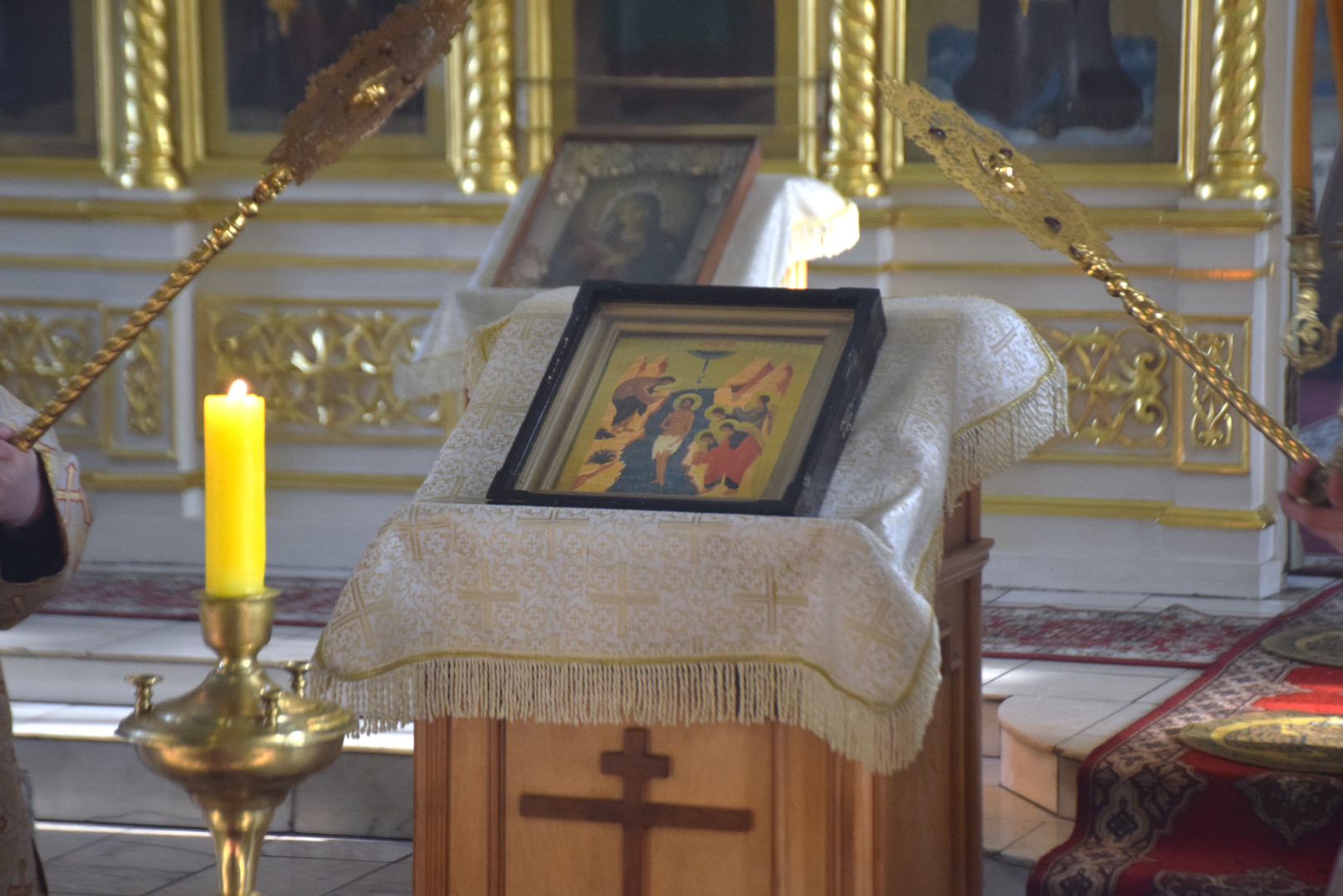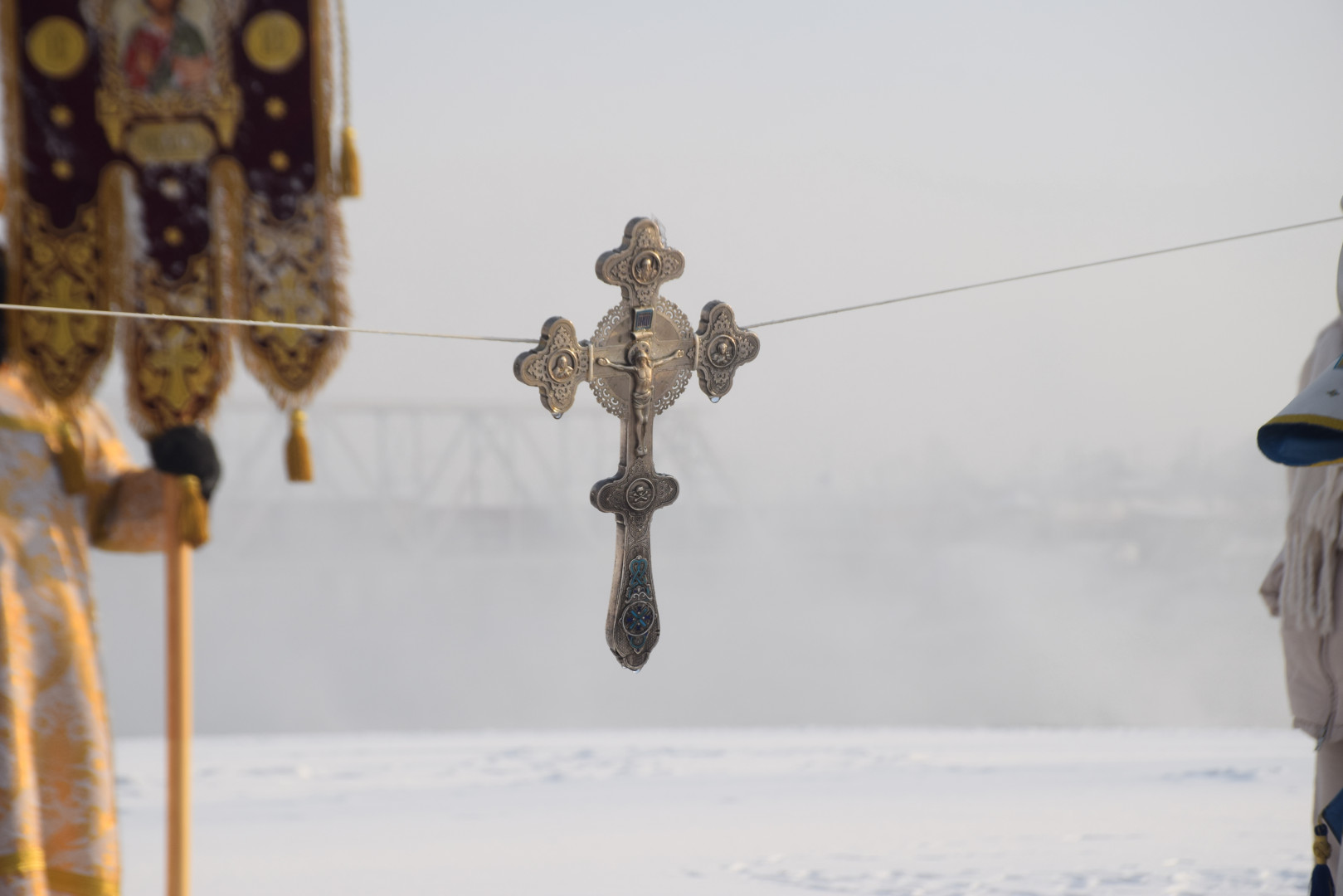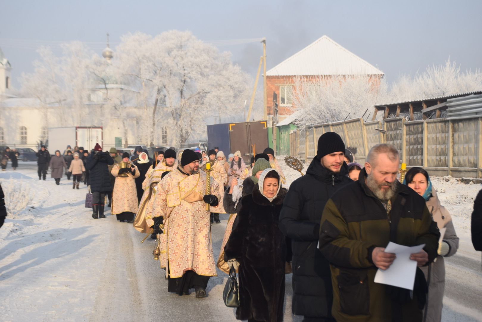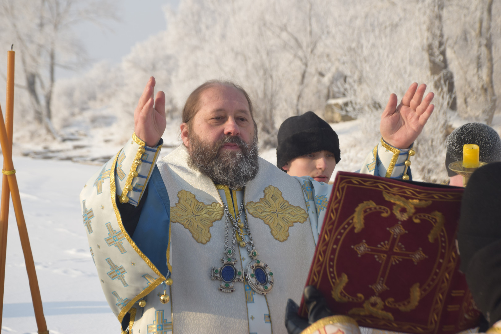 По заамвонной молитве архипастырь, духовенство и все молящиеся при пении стихир «Глас Господень на водах» направились крестным ходом на берег реки Абакан, где традиционно приготавливается крестообразная прорубь — Иордань. Здесь был совершен чин Великого освящения воды: вначале Владыка совершил троекратное каждение вокруг Иордани, были прочитаны паримии, Апостол и Евангелие, а затем протодиаконом была произнесена великая ектения с особыми прошениями об освящении вод. Архиереем была прочитана пространная молитва освящения, после чего в воды реки трижды при троекратном пении тропаря праздника «Во Иордане крещающуся Тебе, Господи» был погружен Честной Крест.