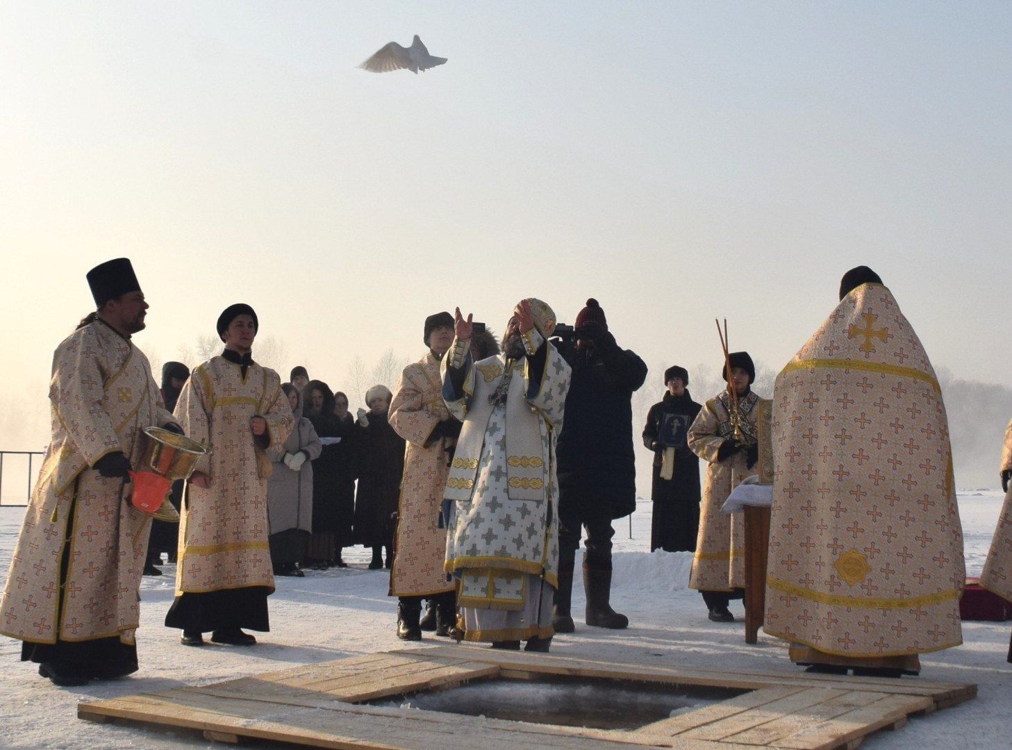 В память явления при Крещении Спасителя Святого Духа «в виде голубине» Владыка выпустил в небо белого голубя.