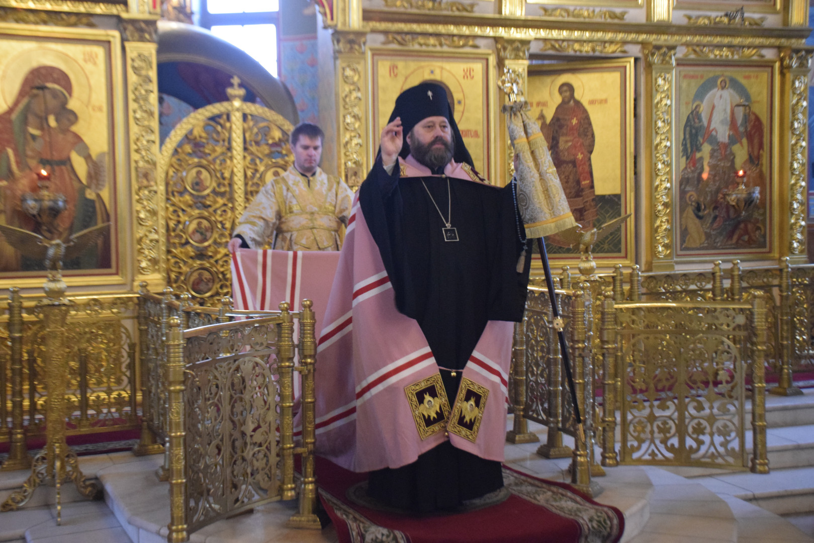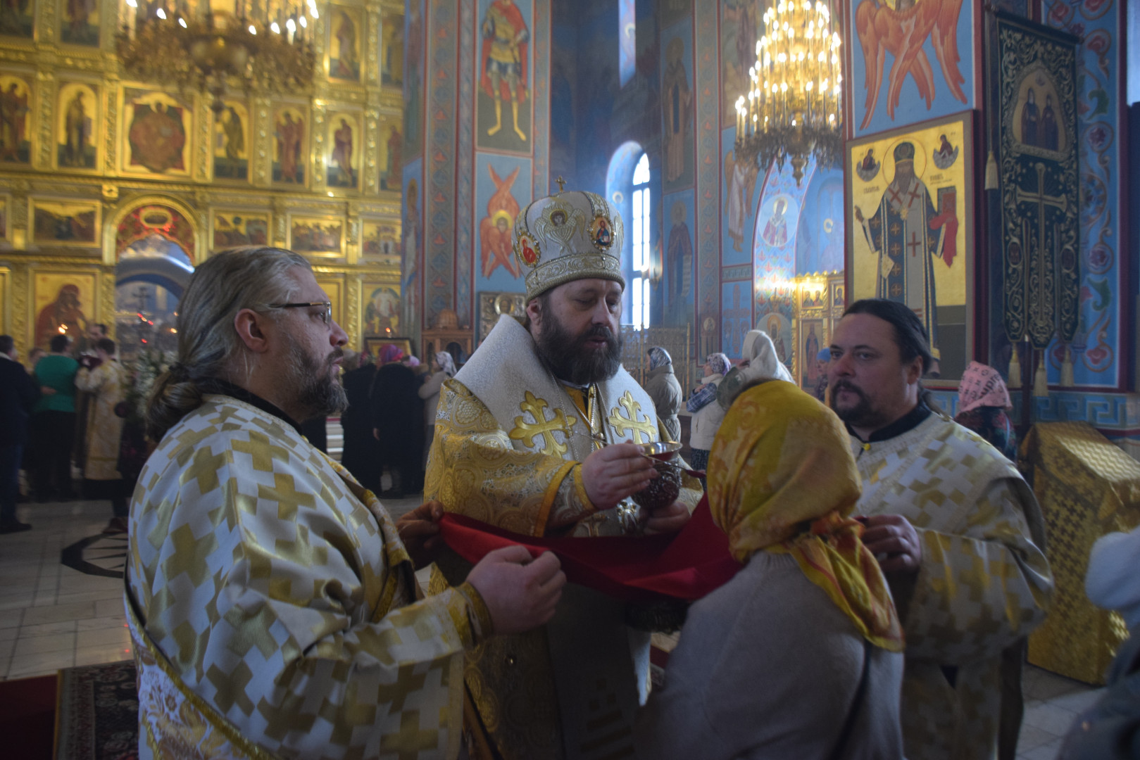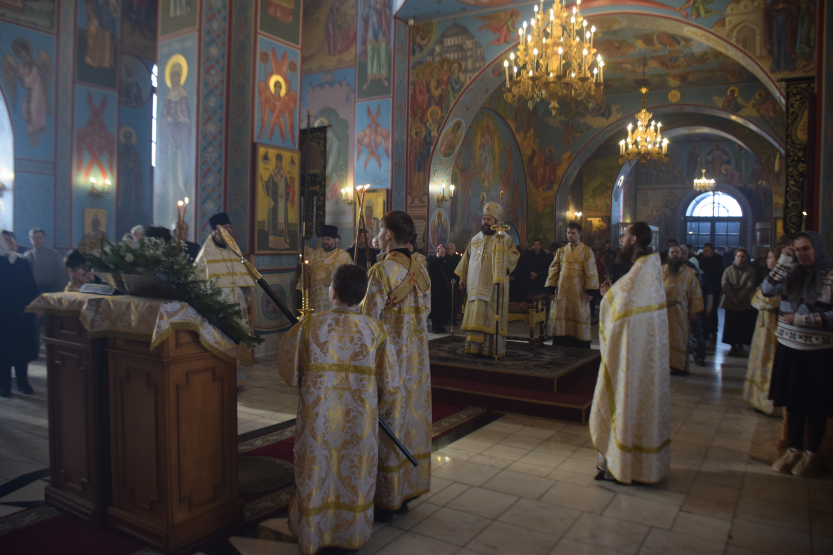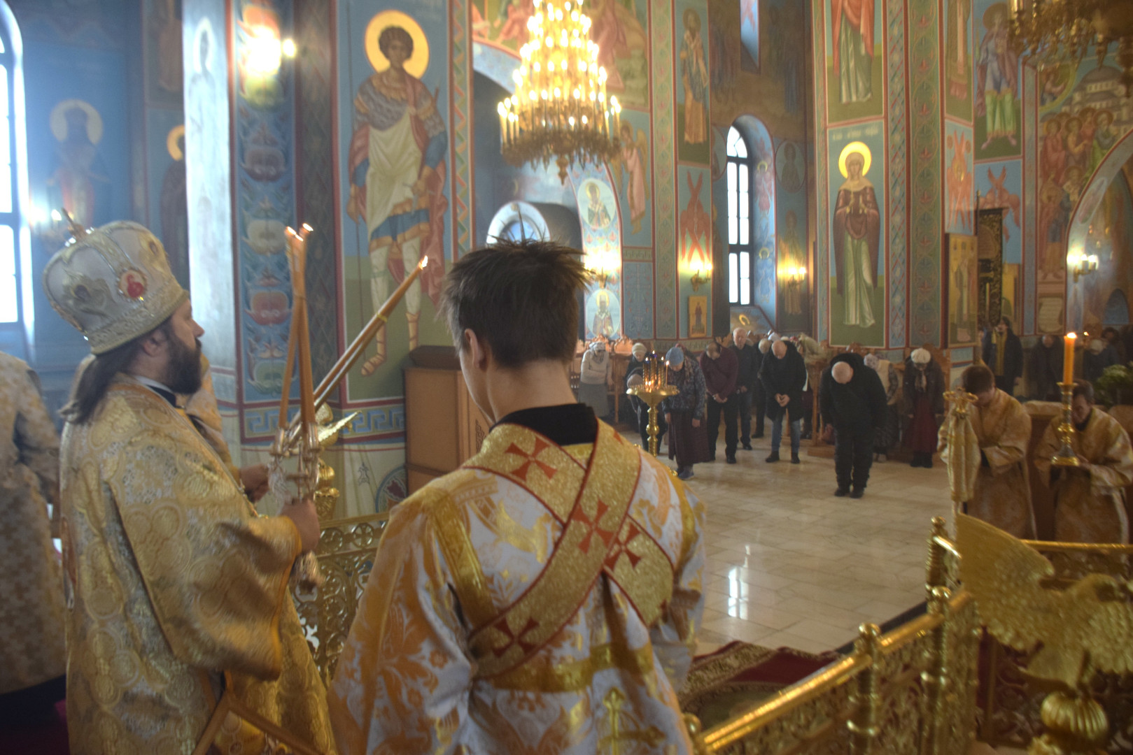 Завершая служение, Правящий архиерей обратился к собравшимся со словом по прочитанному за Литургией Евангелию (обращение Закхея), а также поздравил именинниц, после чего благословлял молящихся.