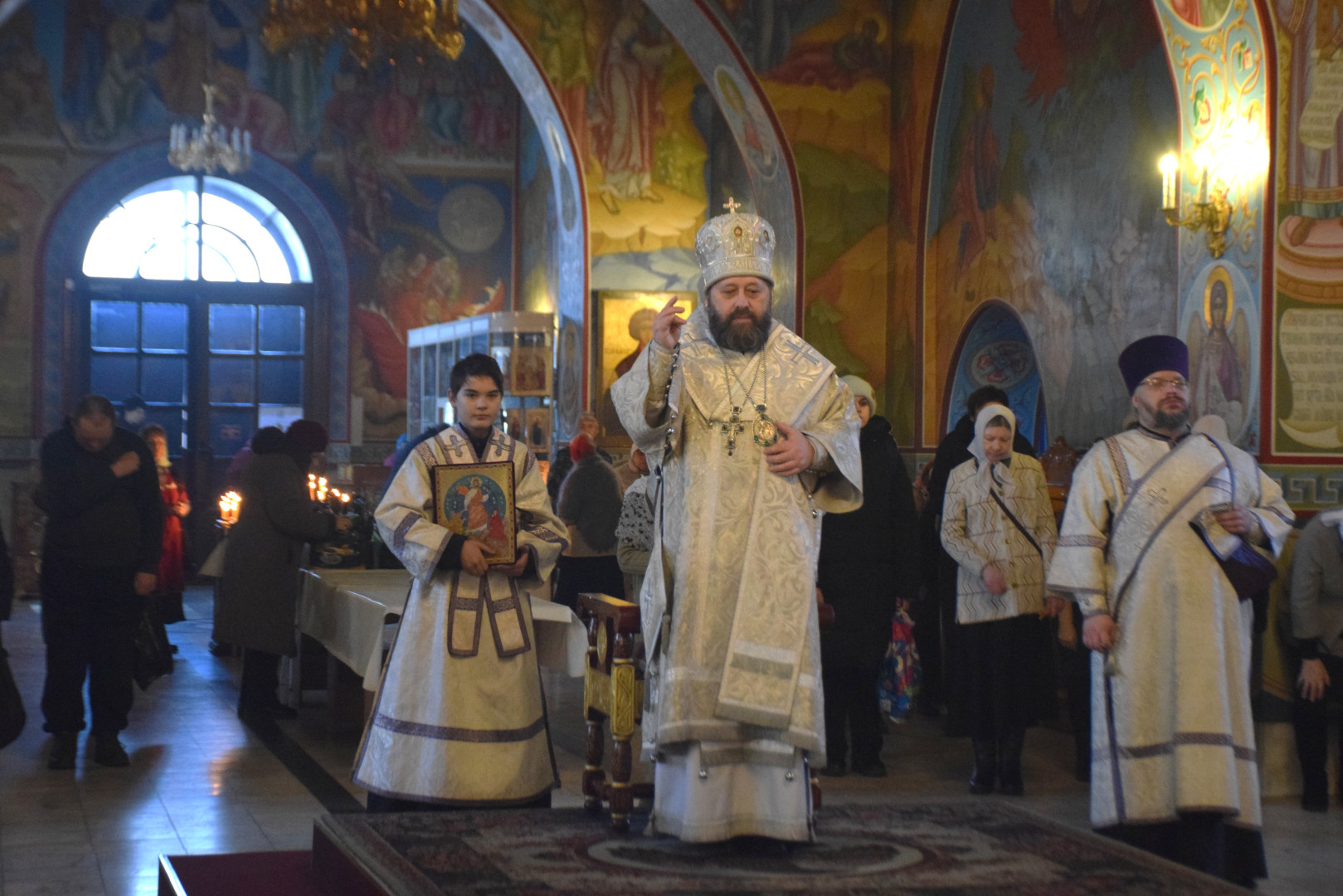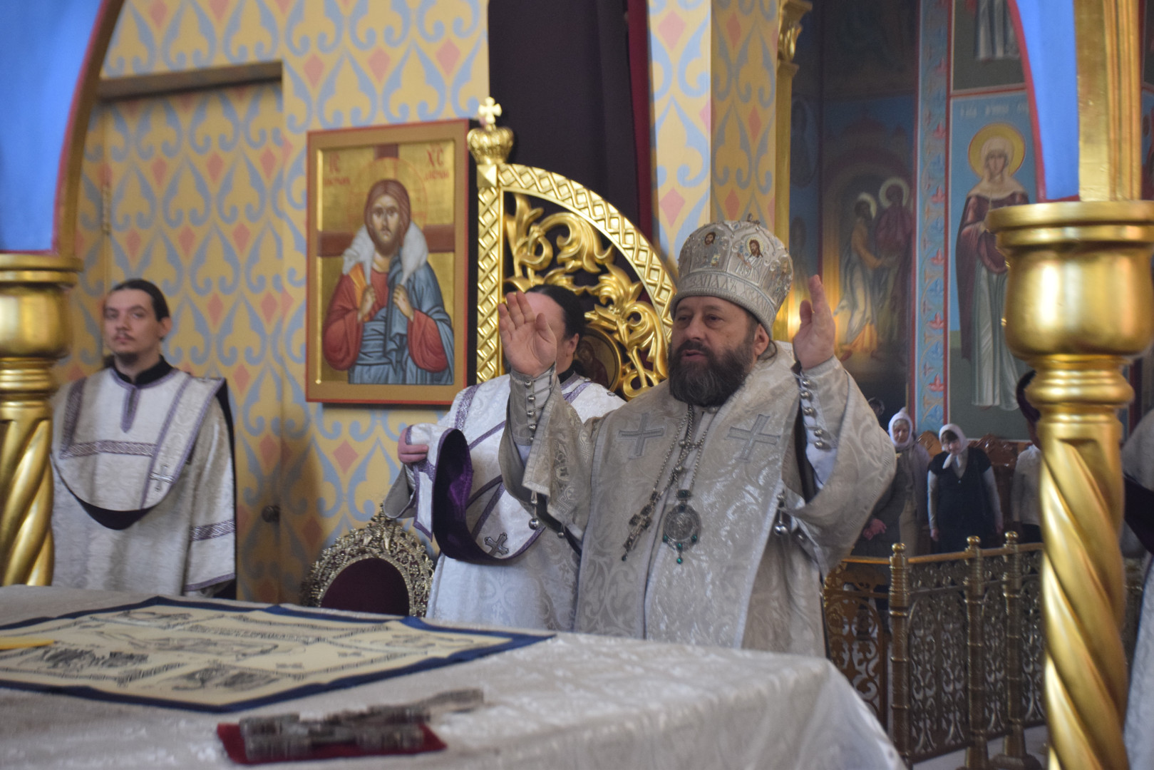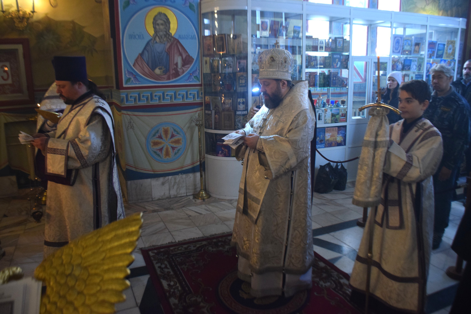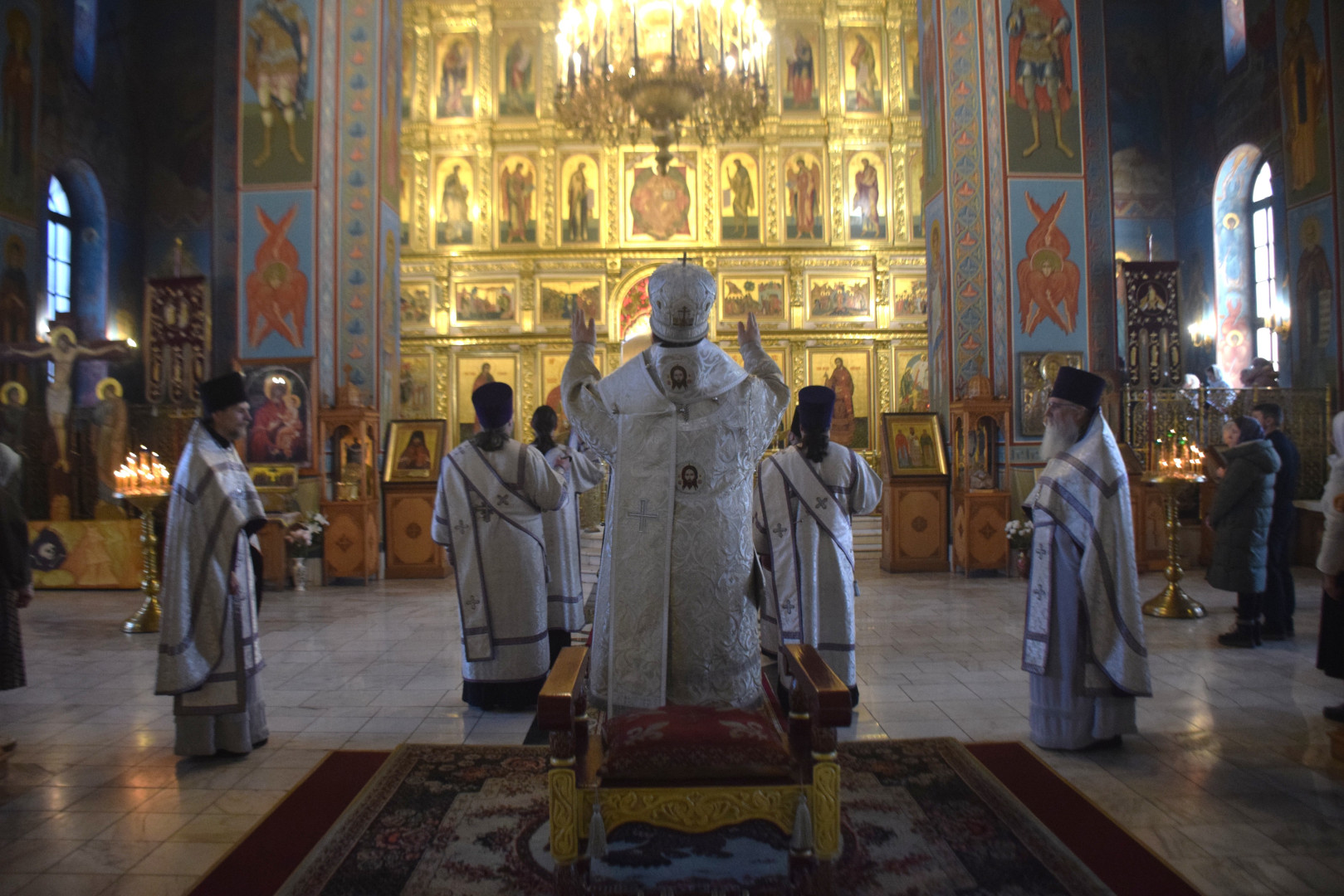 Владыке сослужили протоиерей Олег Попов и священник Павел Кузьмин. Диаконский чин составили протодиакон Андрей Ермаков, диаконы Сергий Симонов, Владислав Бойченко и Михаил Луцик.