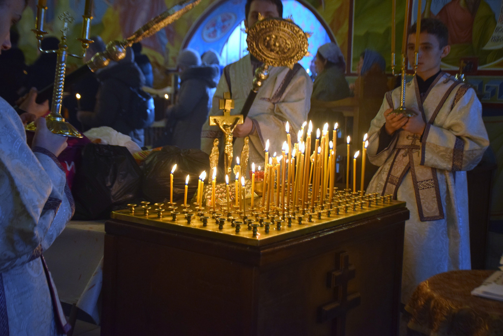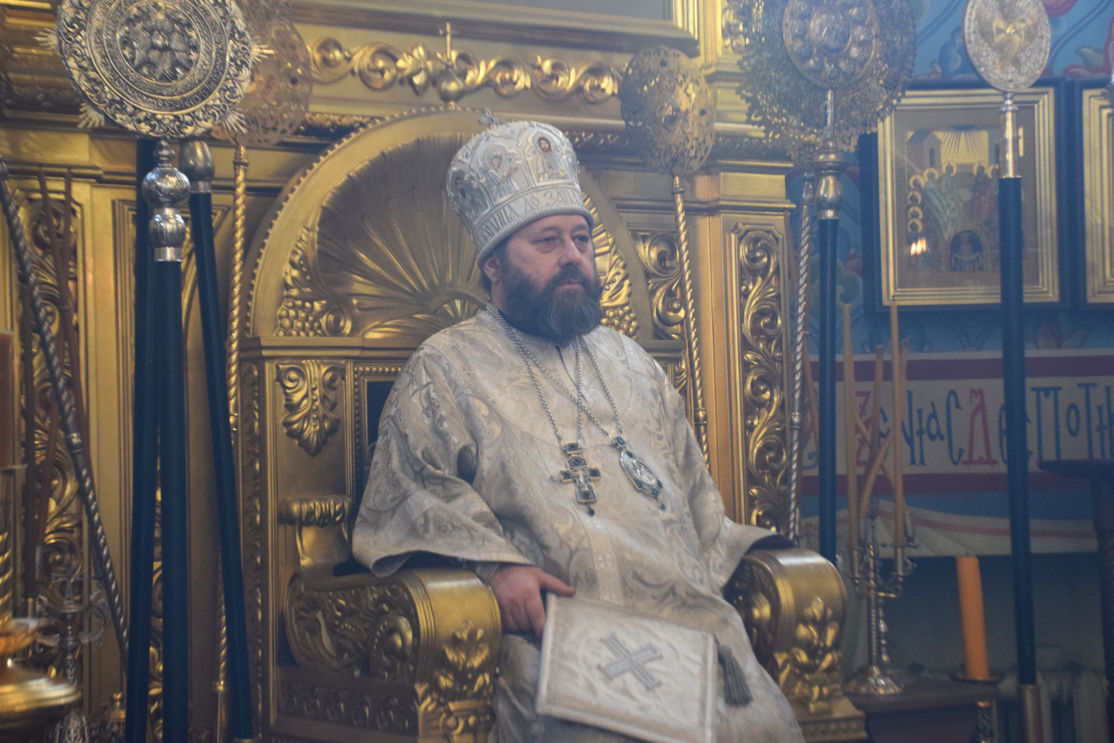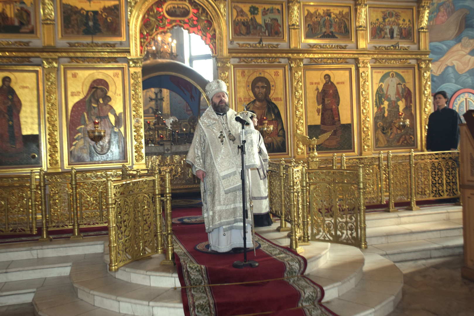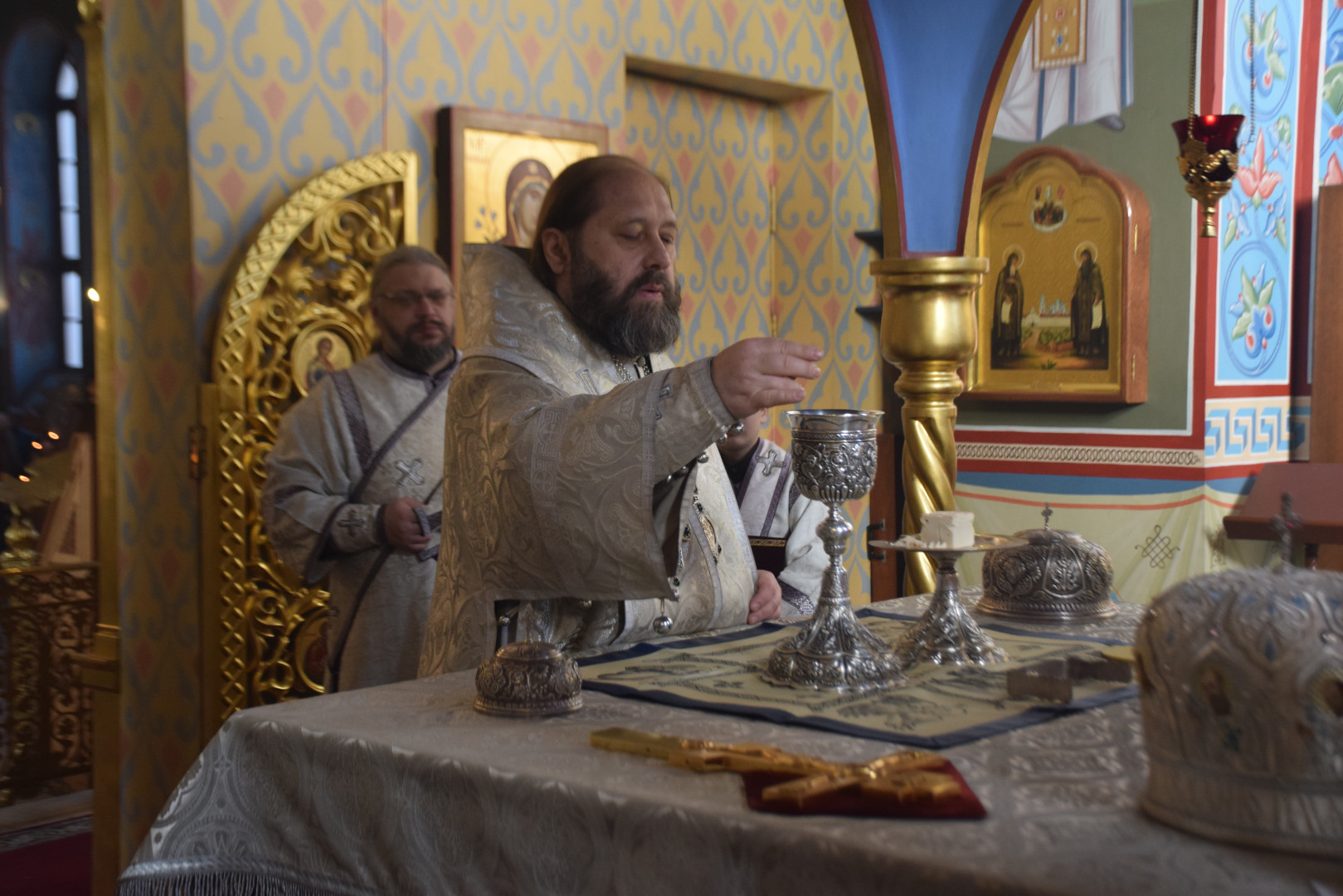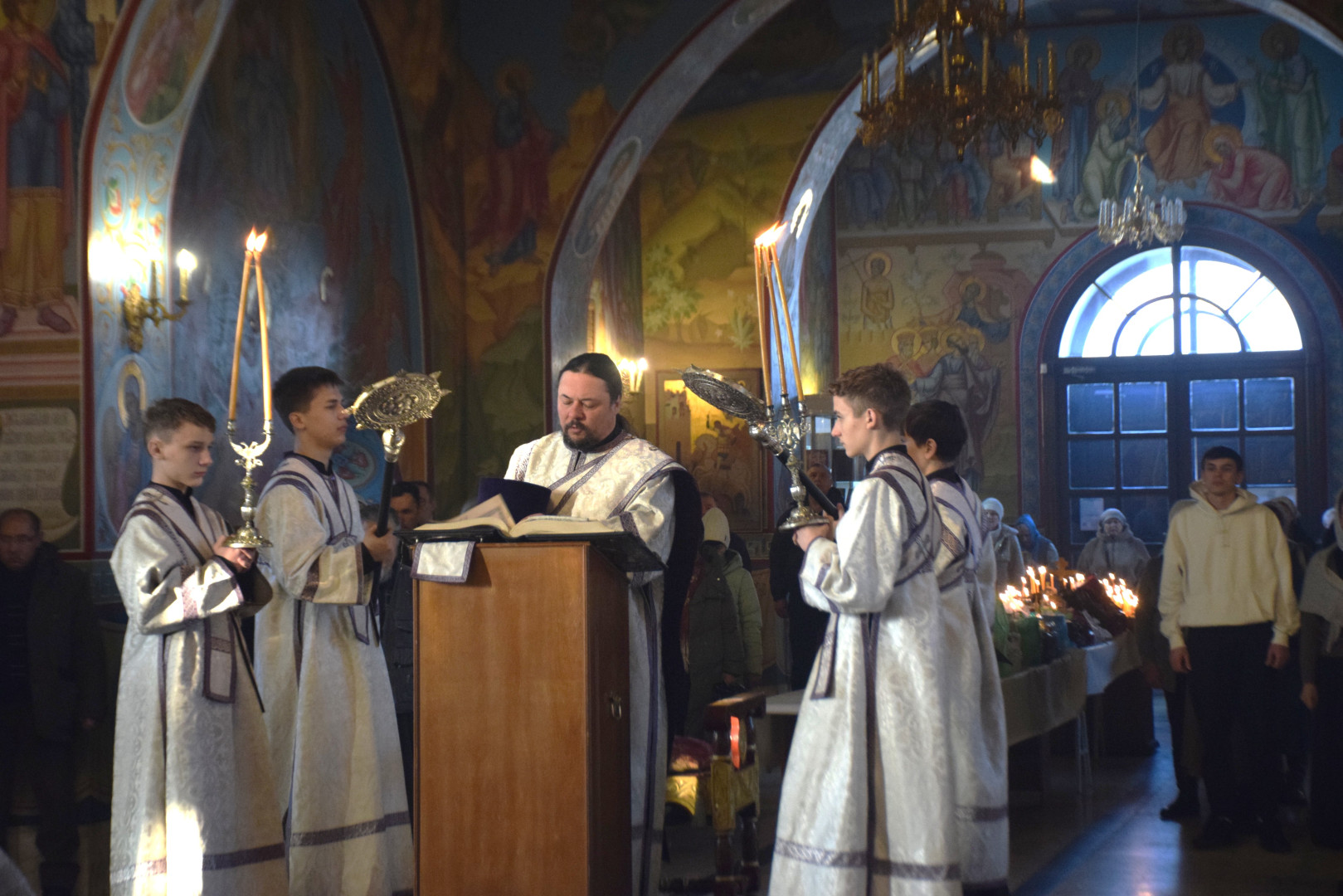 Владыке сослужили протоиерей Олег Попов и священник Павел Кузьмин. Диаконский чин составили протодиакон Андрей Ермаков, диаконы Сергий Симонов, Владислав Бойченко и Михаил Луцик.