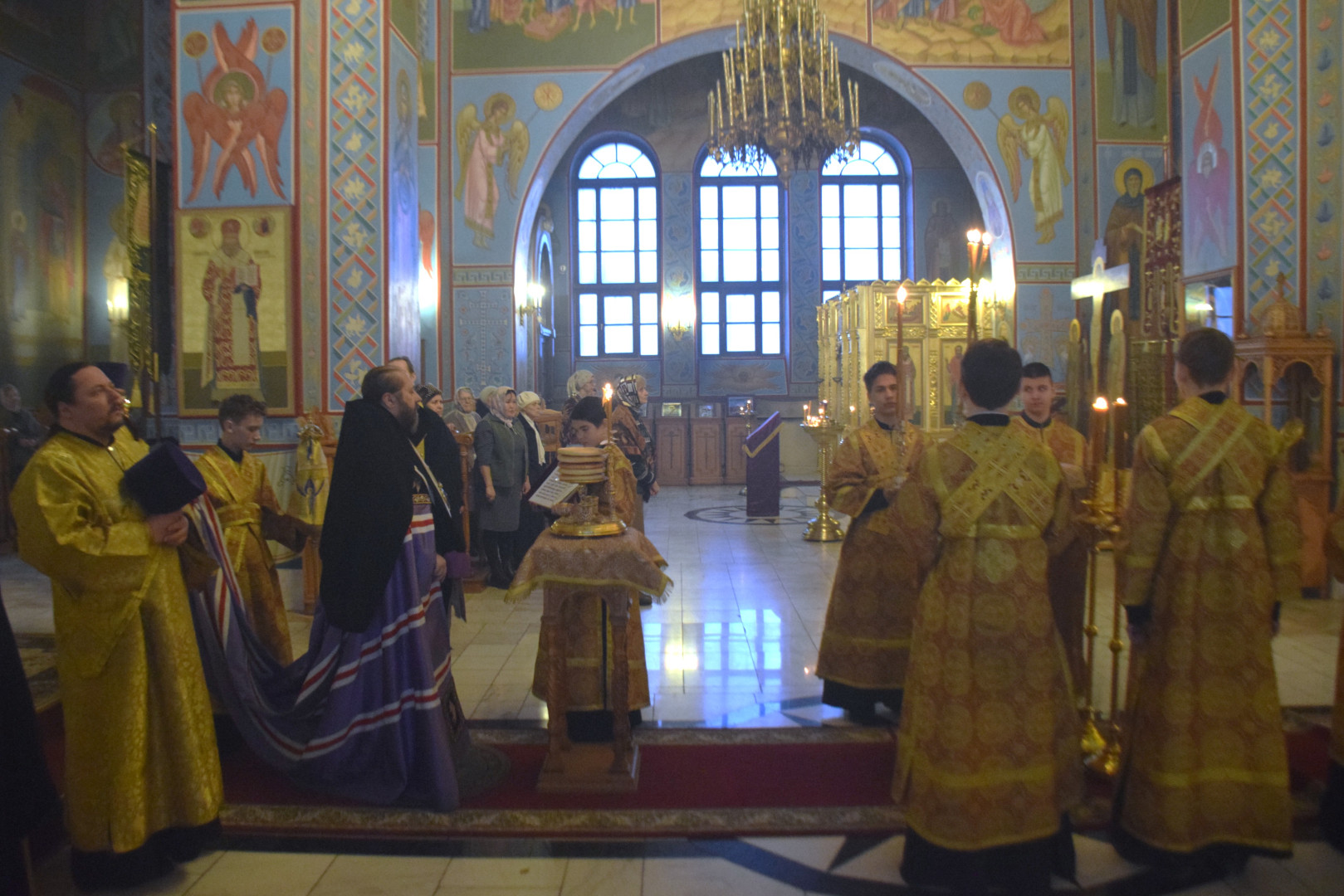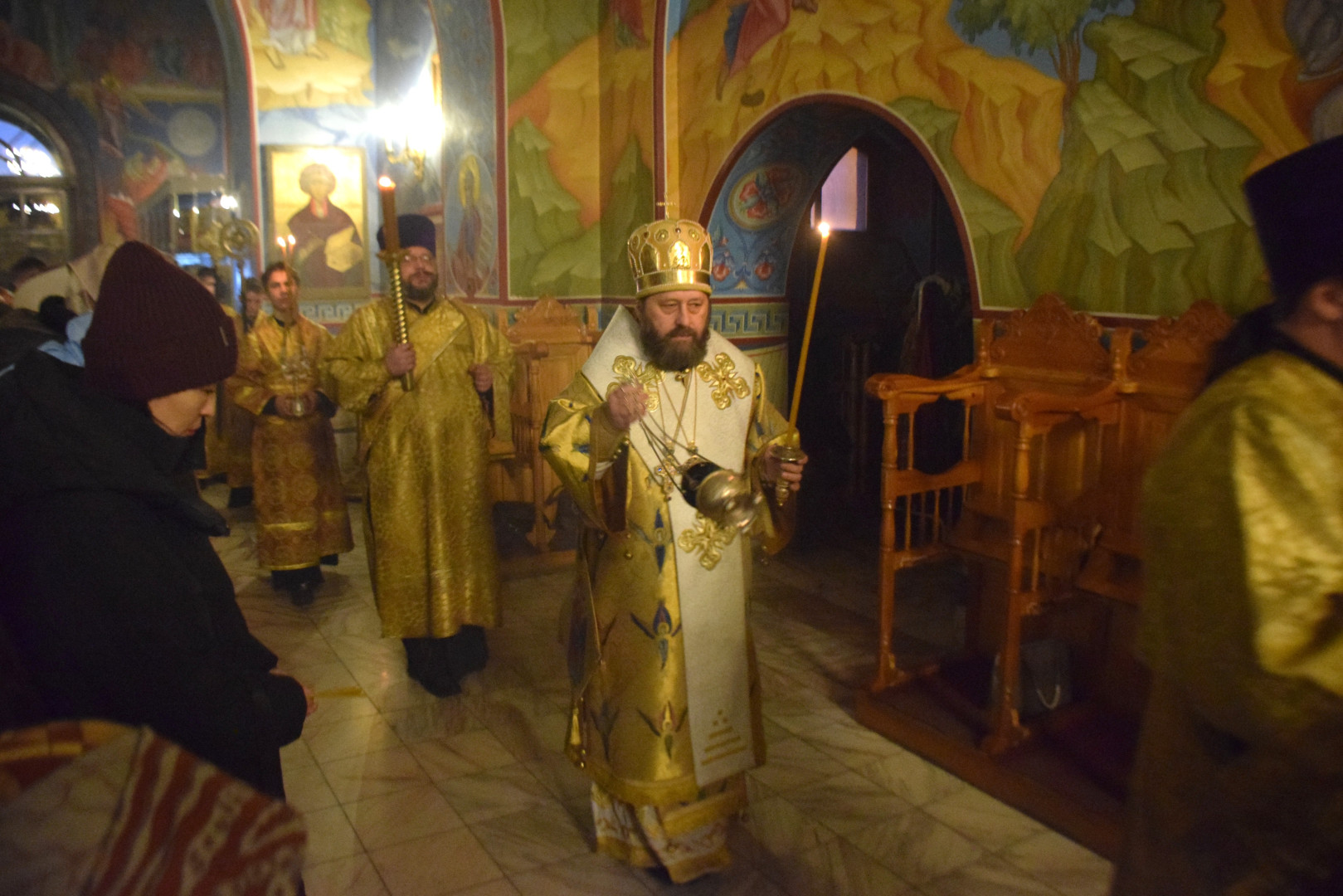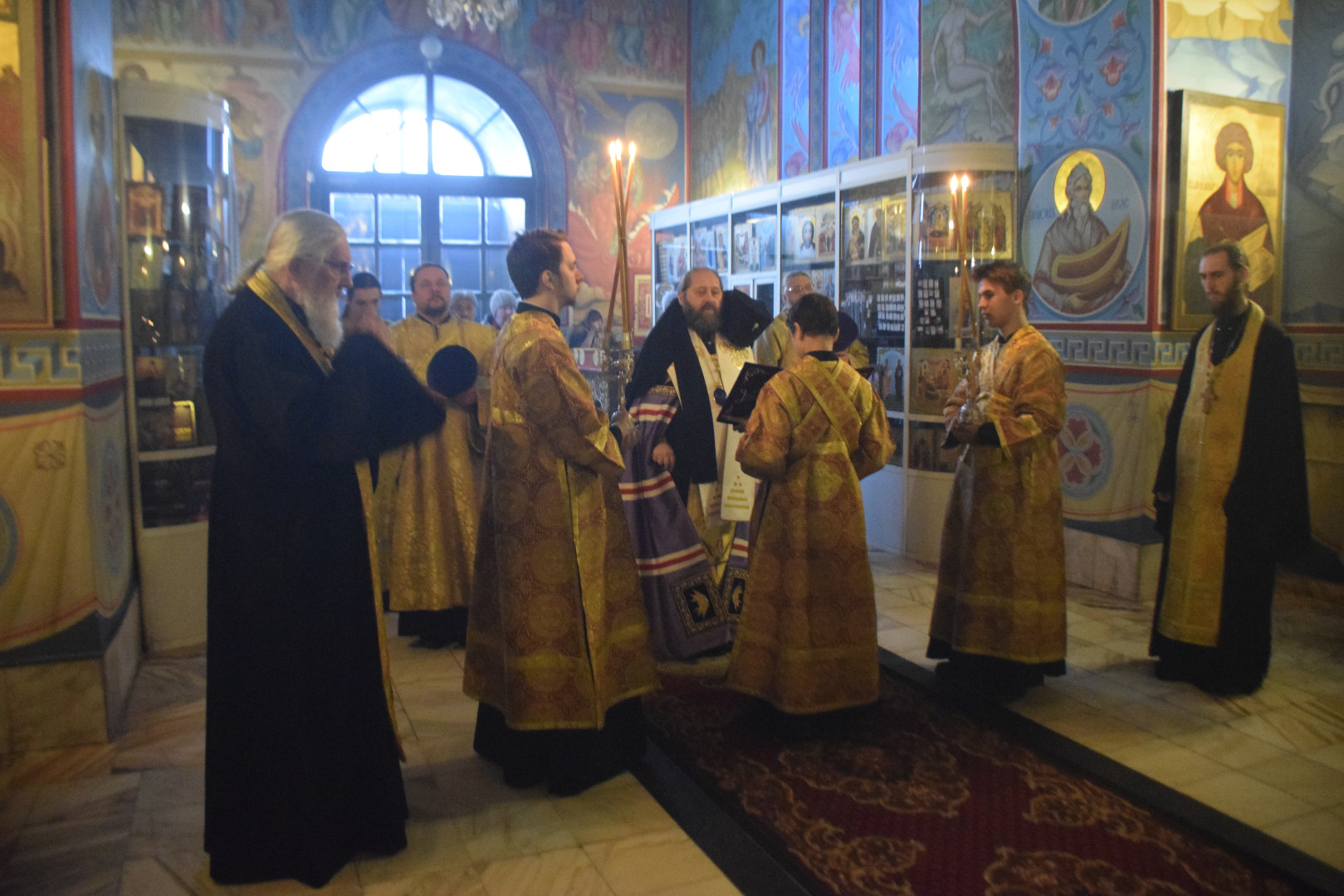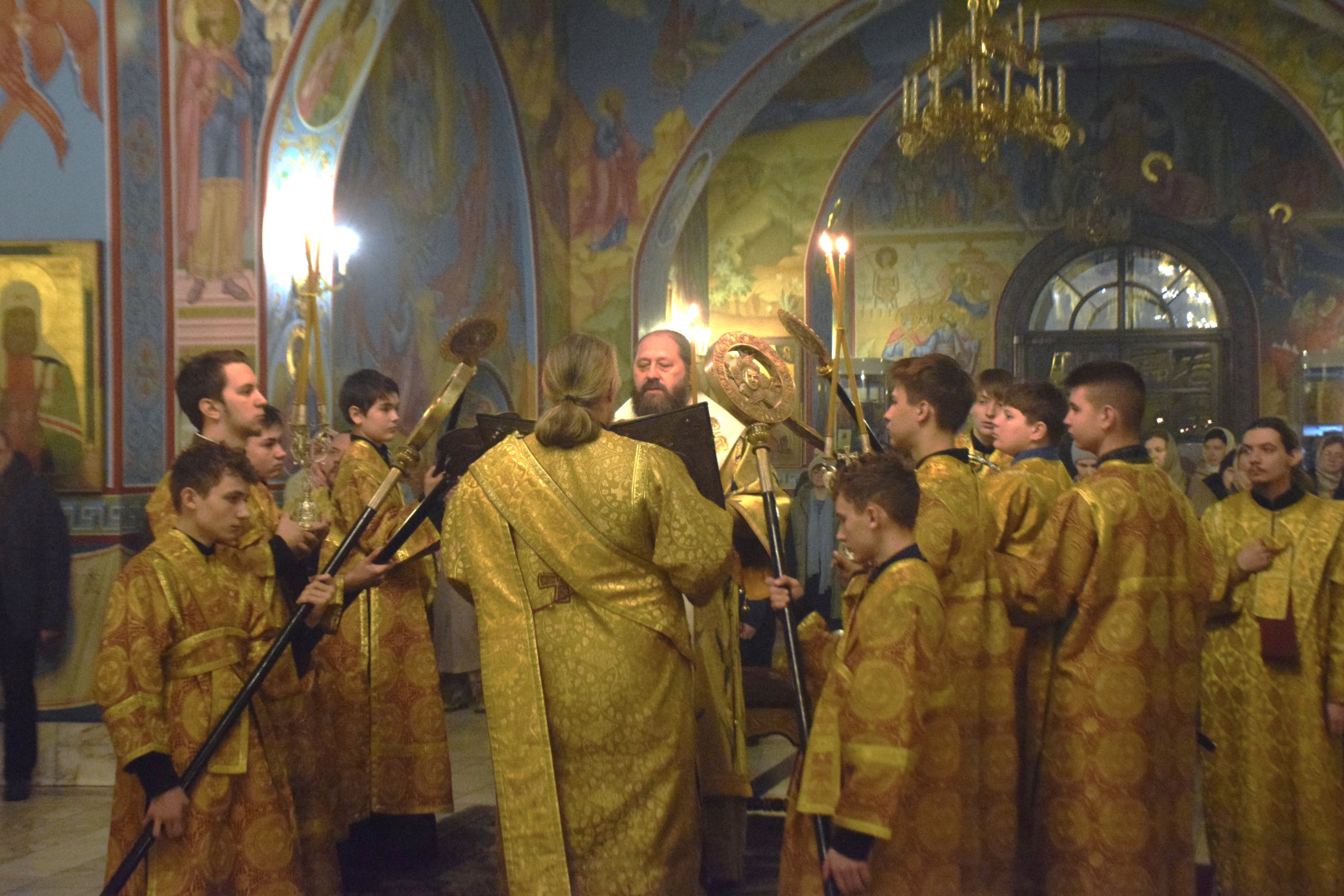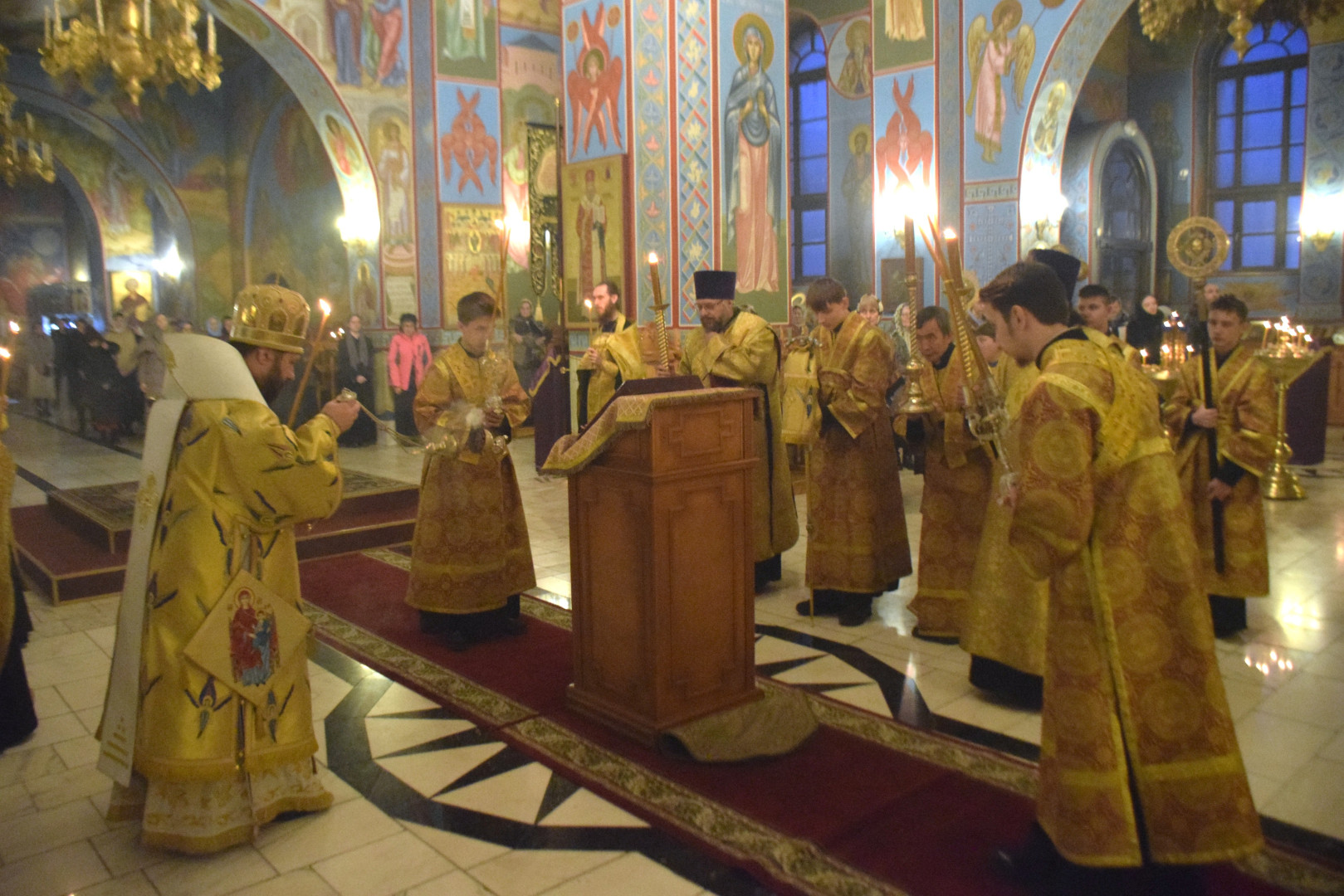 Архипастырю сослужили протоиерей Олег Попов, священники Николай Пугин и Евгений Девятов. Диаконский чин составили протодиакон Андрей Ермаков, диаконы Сергий Симонов, Владислав Бойченко и иеродиакон Нестор (Рыбин). Песнопения Всенощного бдения исполнил архиерейский хор под управлением М. Ермаковой.