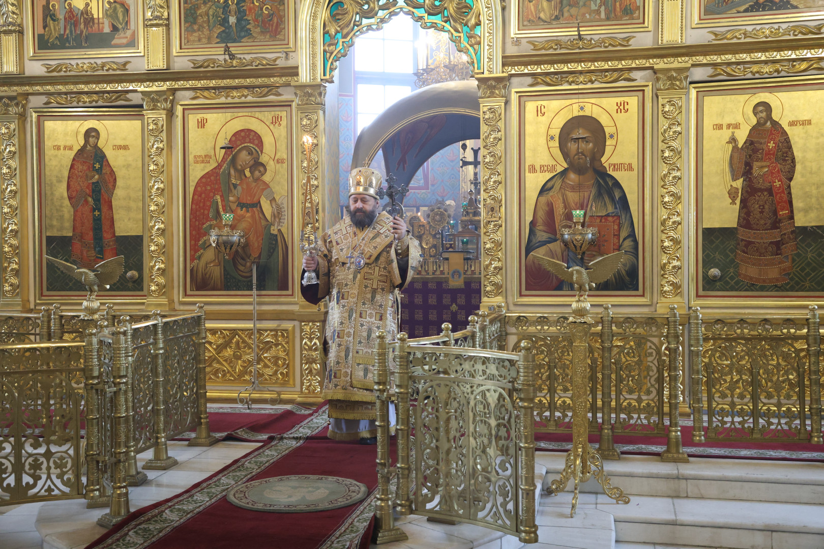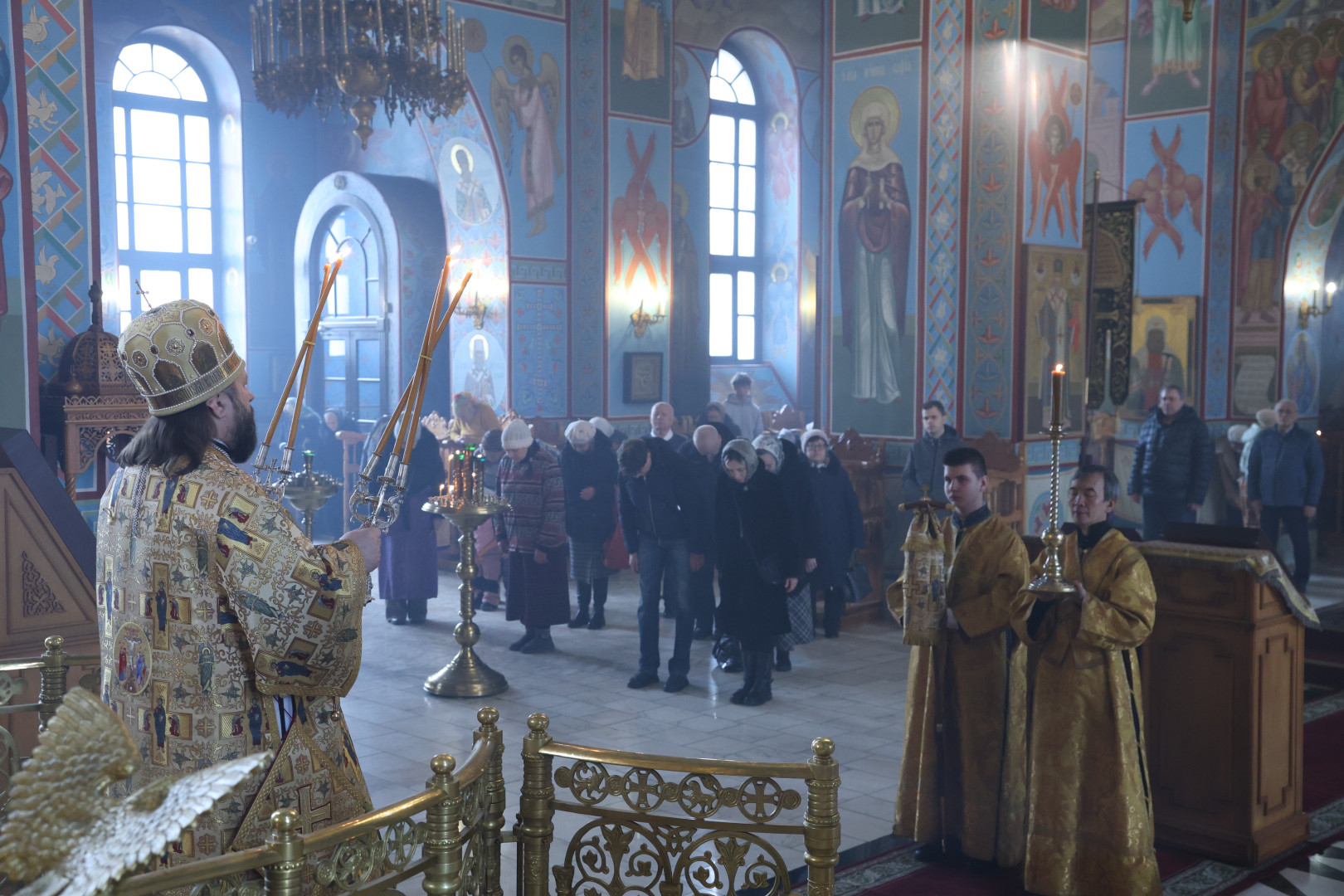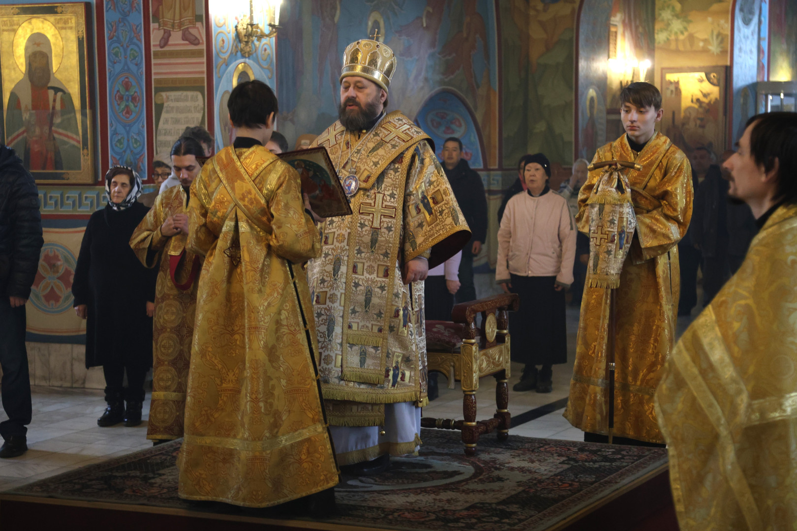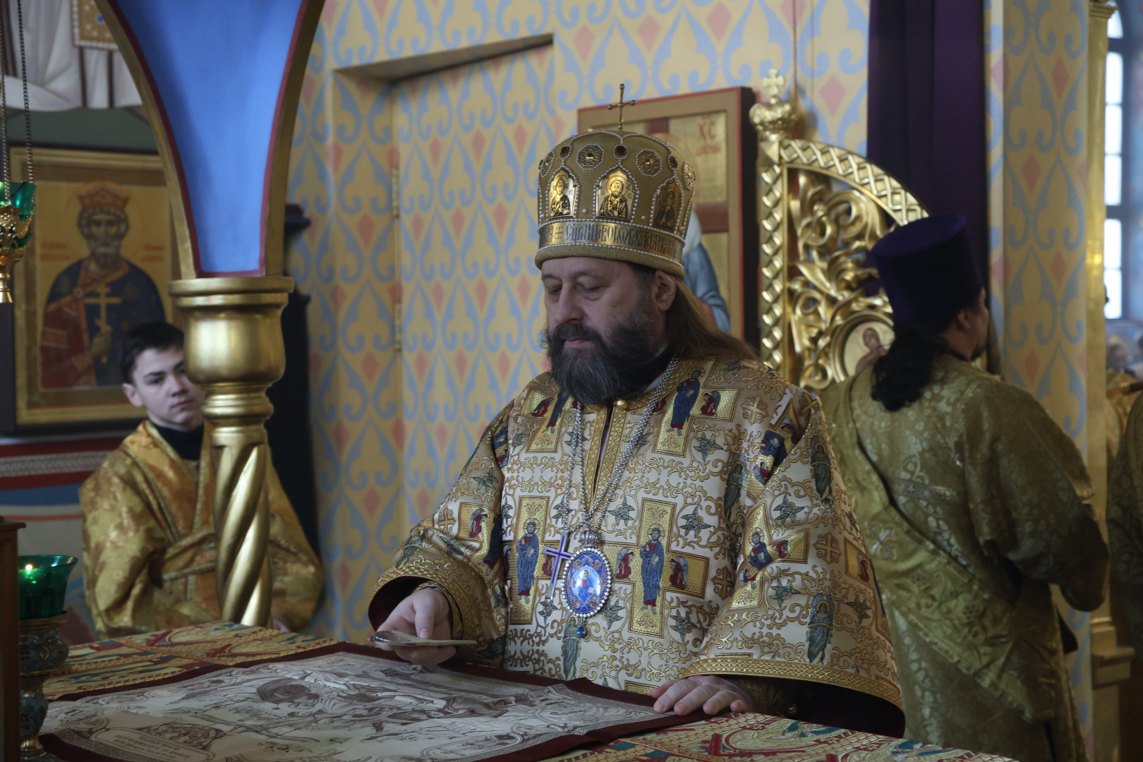 Владыке сослужили протоиерей Олег Попов и священник Евгений Девятов. Диаконский чин составили протодиакон Андрей Ермаков, диаконы Сергий Симонов, Владислав Бойченко Михаил Луцик и иеродиакон Нестор (Рыбин). Богослужебные песнопения исполнил архиерейский хор собора под управлением Марии Ермаковой.