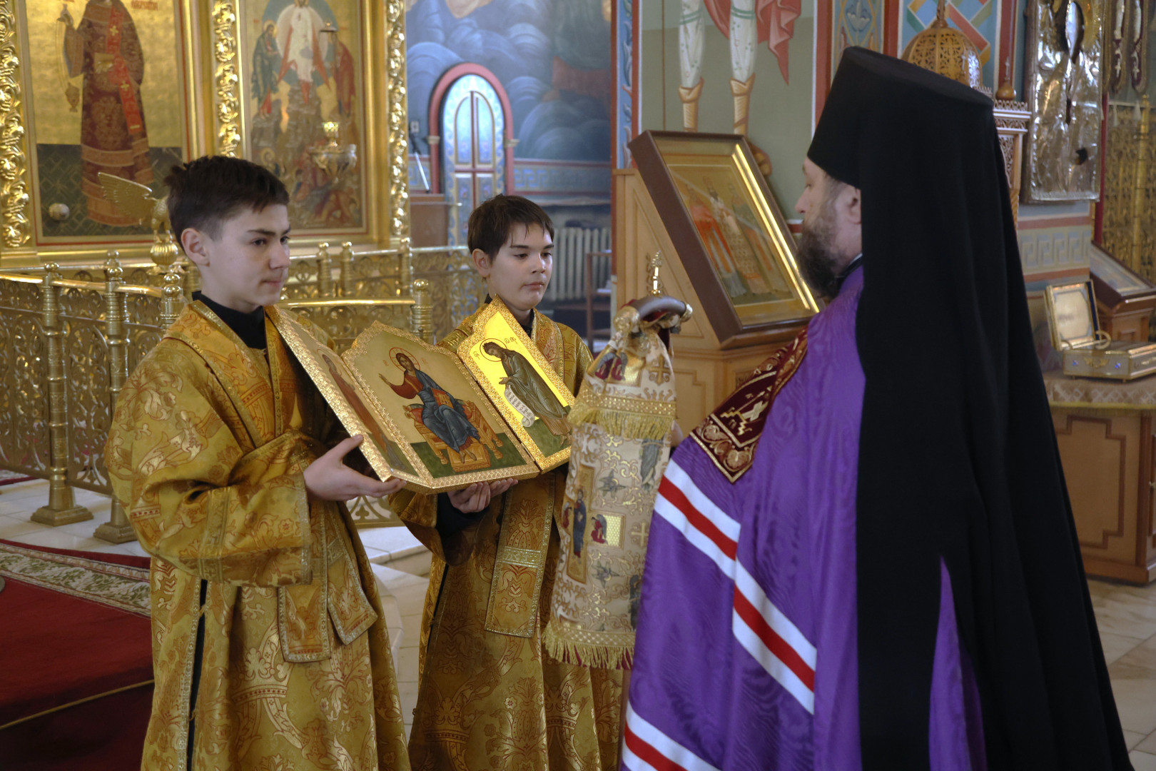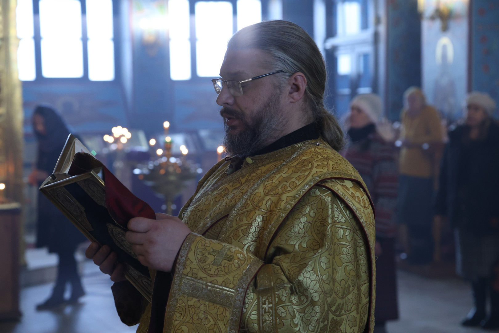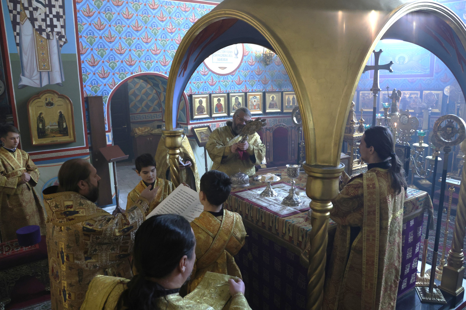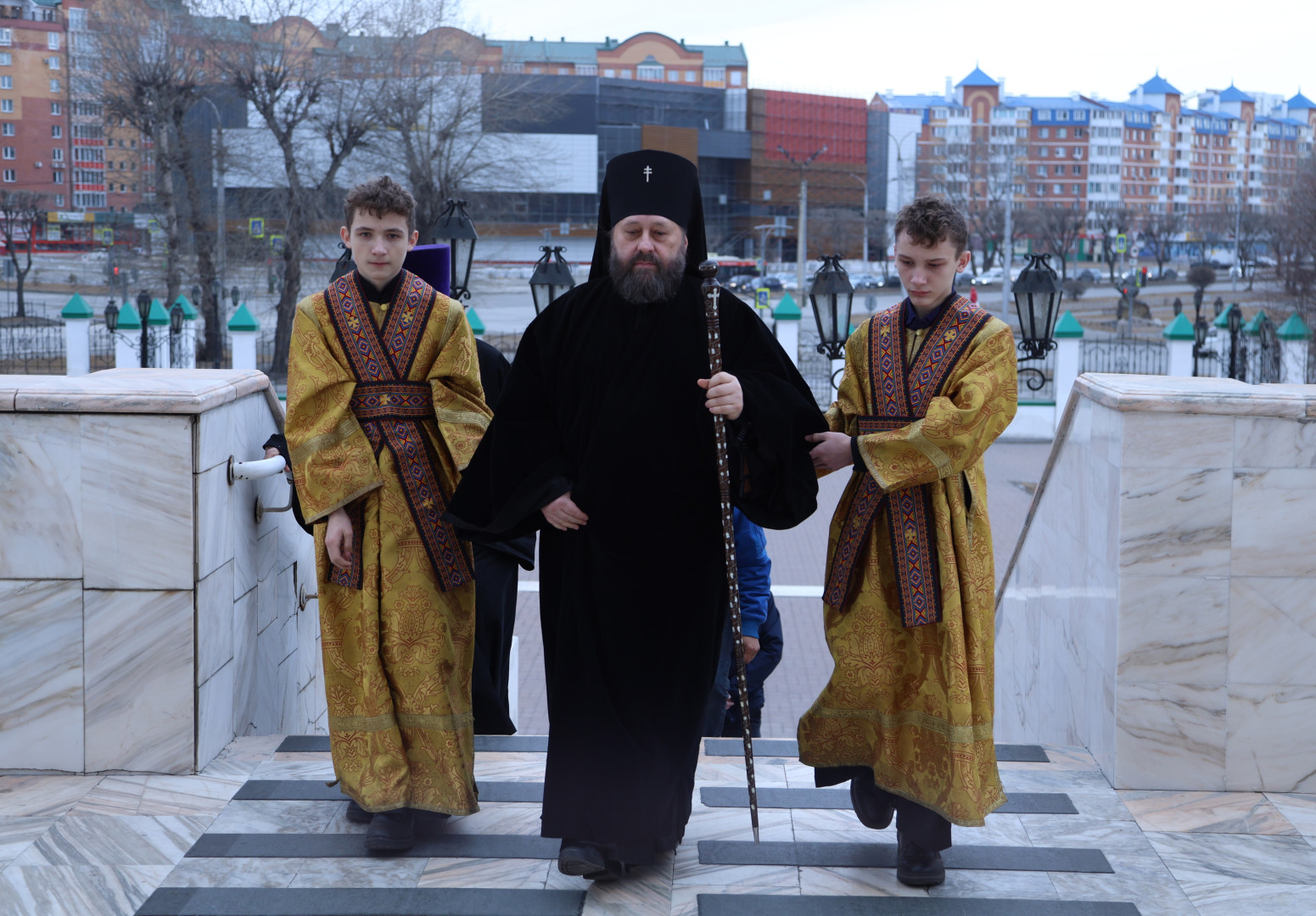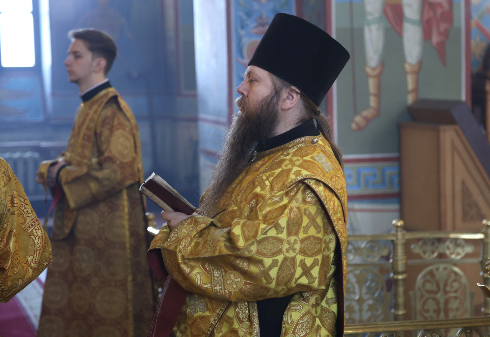 Владыке сослужили протоиерей Олег Попов и священник Евгений Девятов. Диаконский чин составили протодиакон Андрей Ермаков, диаконы Сергий Симонов, Владислав Бойченко Михаил Луцик и иеродиакон Нестор (Рыбин). Богослужебные песнопения исполнил архиерейский хор собора под управлением Марии Ермаковой.