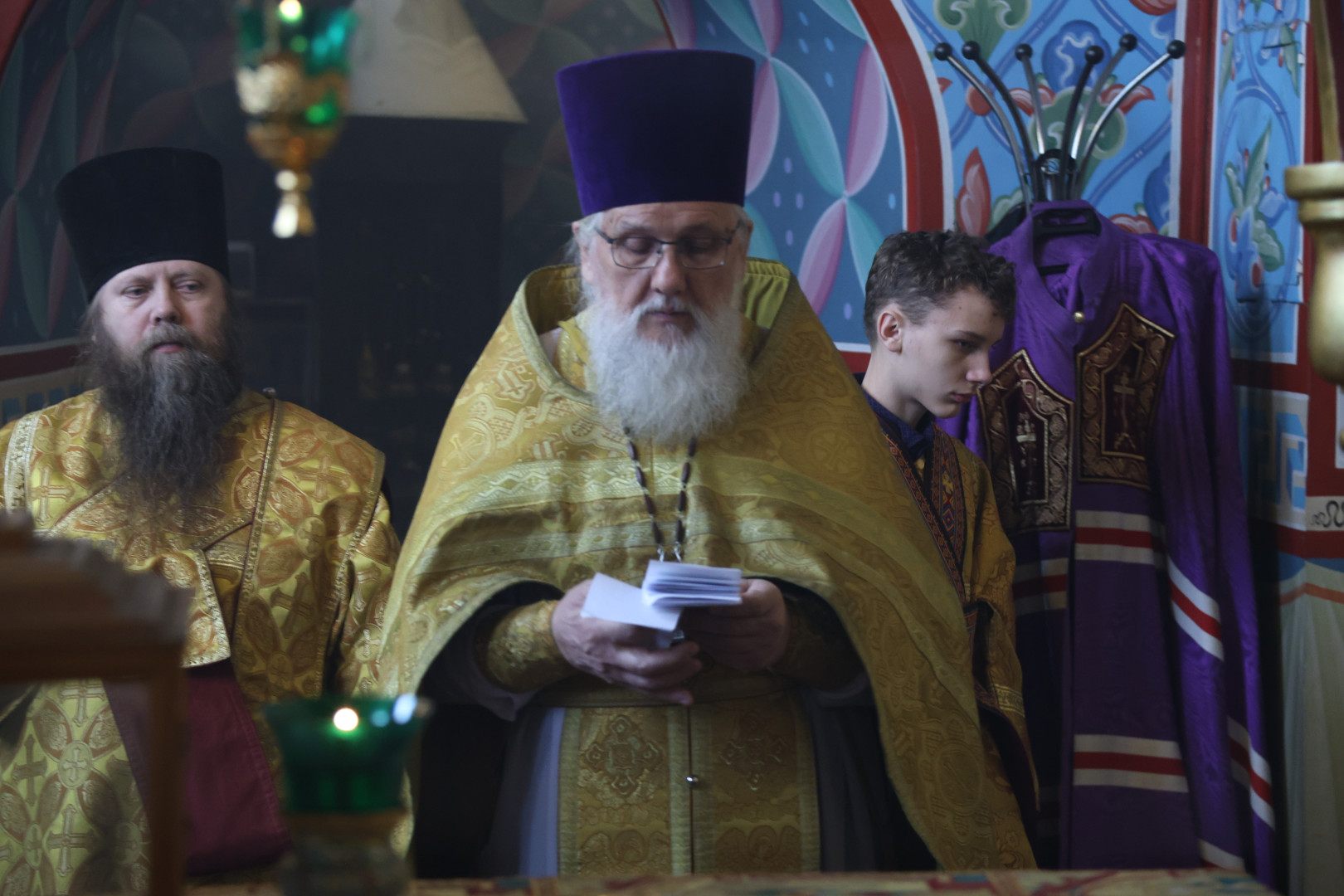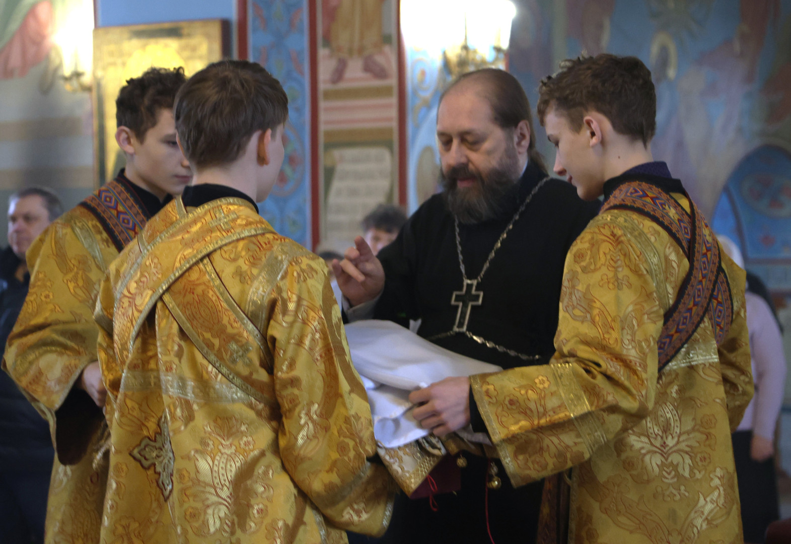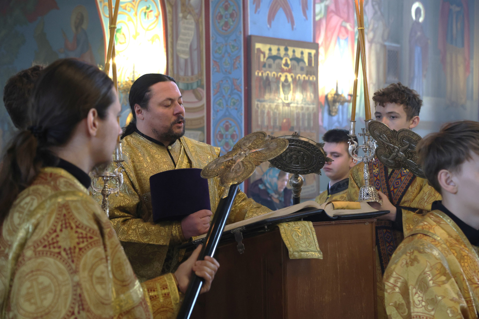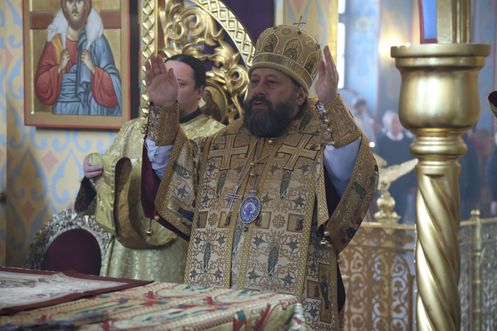 Владыке сослужили протоиерей Олег Попов и священник Евгений Девятов. Диаконский чин составили протодиакон Андрей Ермаков, диаконы Сергий Симонов, Владислав Бойченко Михаил Луцик и иеродиакон Нестор (Рыбин). Богослужебные песнопения исполнил архиерейский хор собора под управлением Марии Ермаковой.