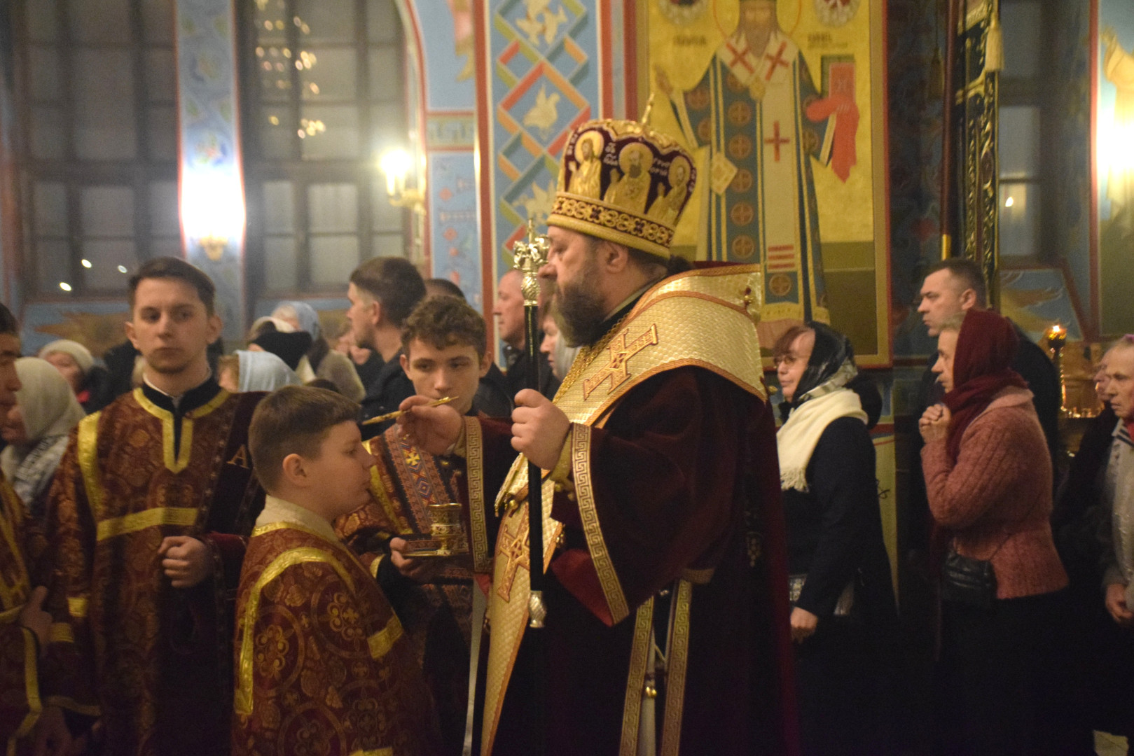 По Великом славословии Крест был торжественно изнесен на середину храма для поклонения, а затем архиерей совершал помазание освященным елеем молящихся.