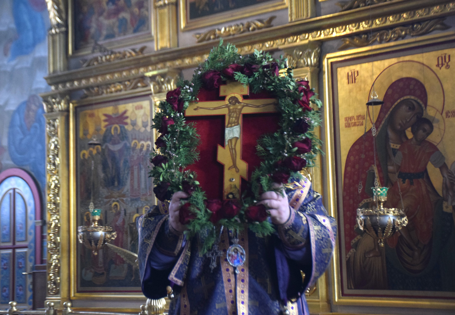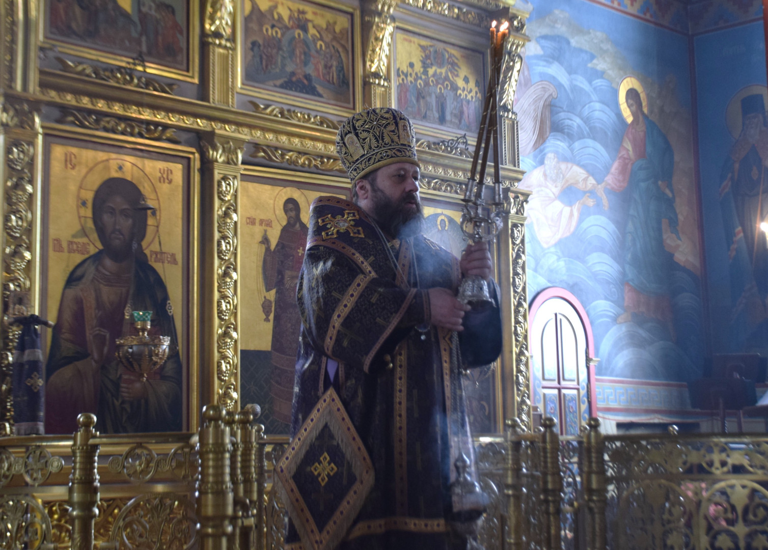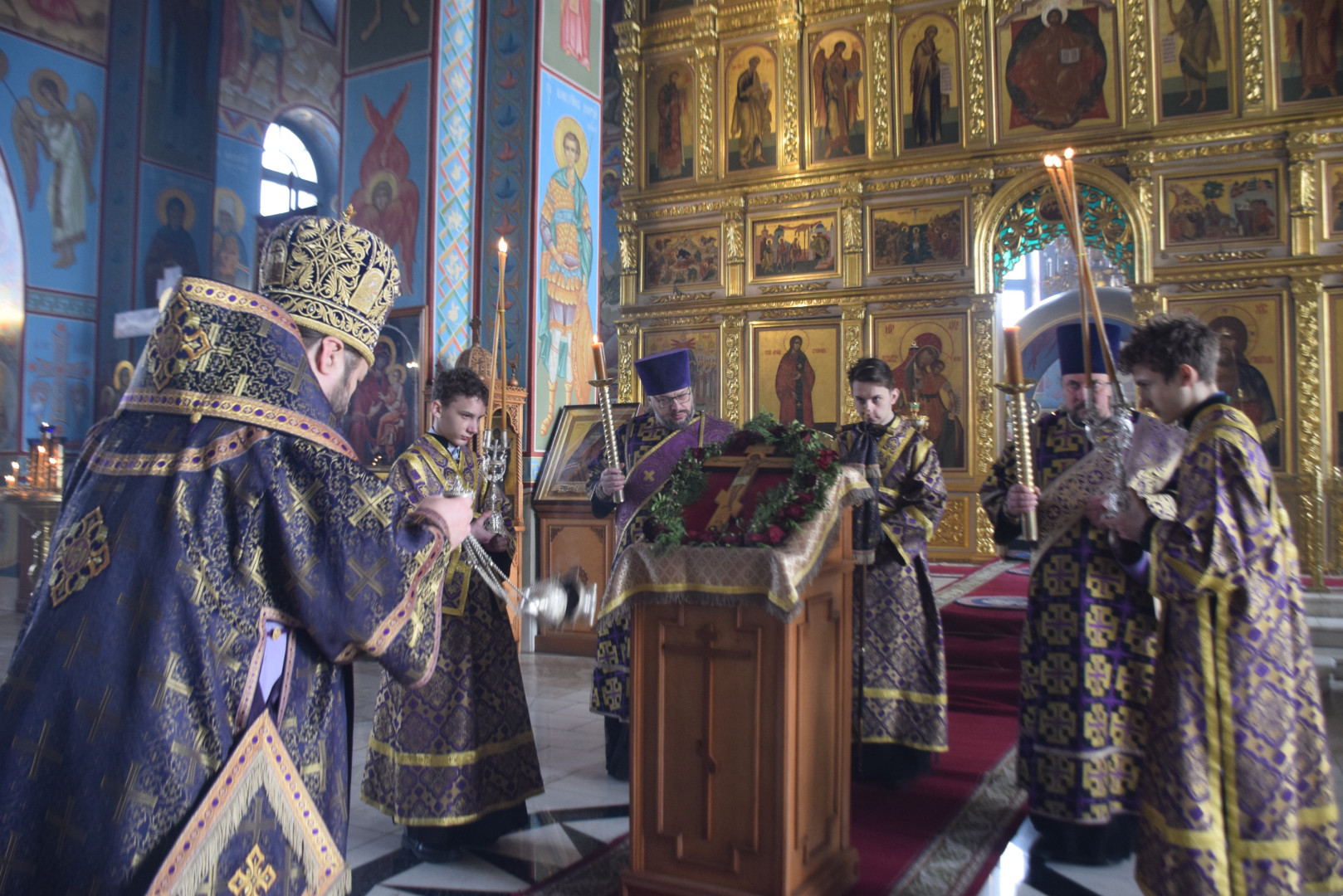 По заамвонной молитве было совершено поклонение Честному Кресту, и по троекратном каждении Крест был внесен в алтарь. По отпусте Литургии Преосвященный проповедовал.