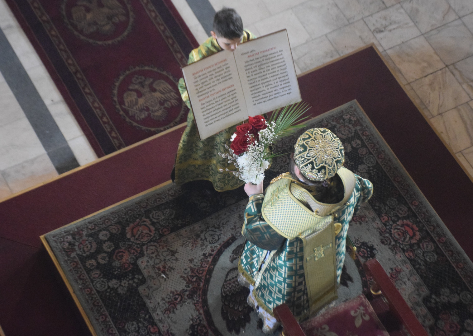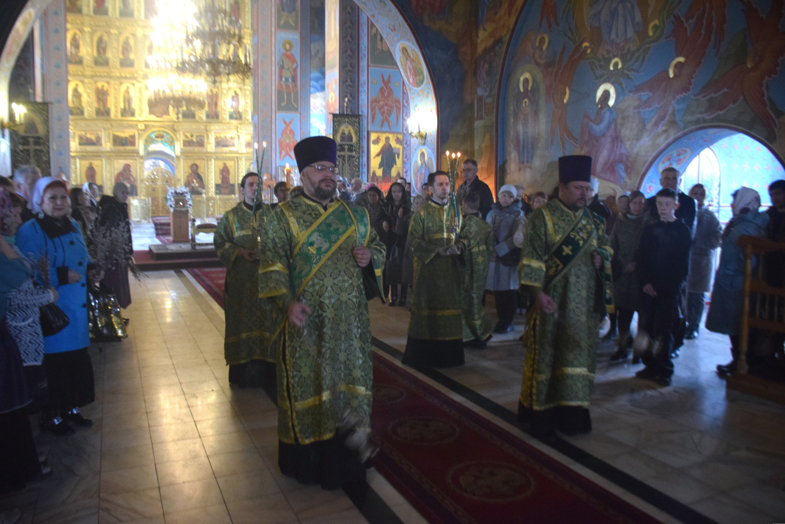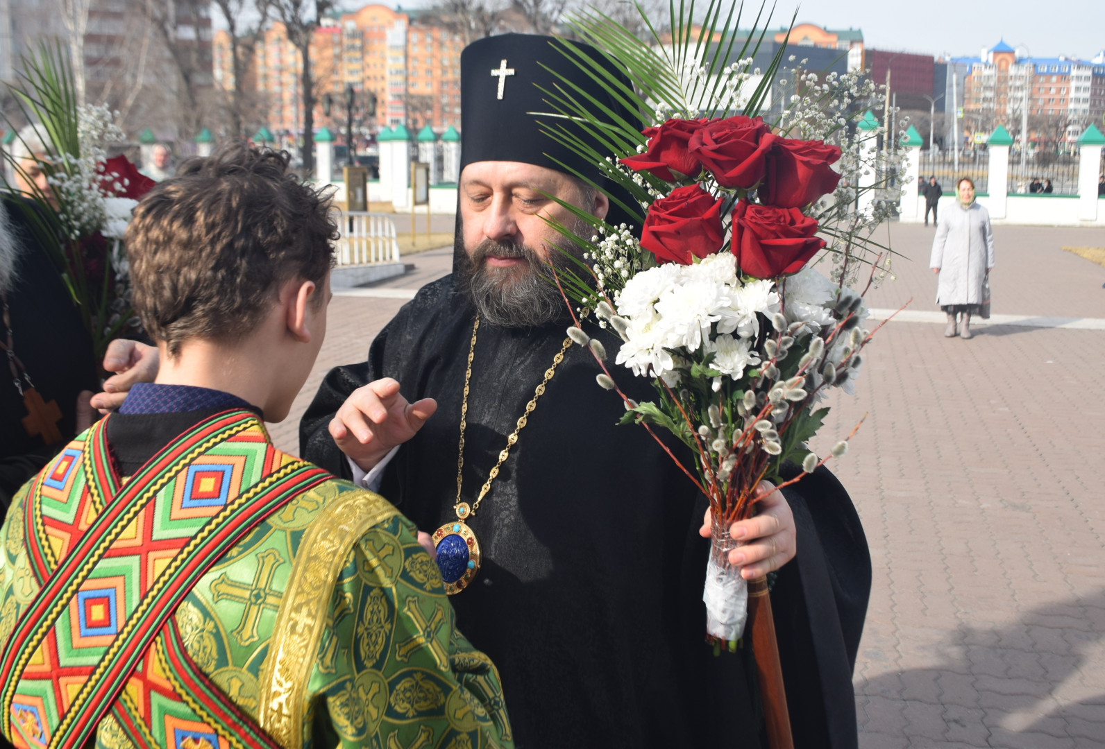 5 апреля 2026 года, в день великого праздника Входа Господня в Иерусалим, Неделю цветоносную, ваий, (Вербное воскресенье) Преосвященный архиепископ Абаканский и Хакасский Ионафан совершил праздничную Божественную Литургию в Спасо-Преображенском кафедральном соборе столицы Хакасии.