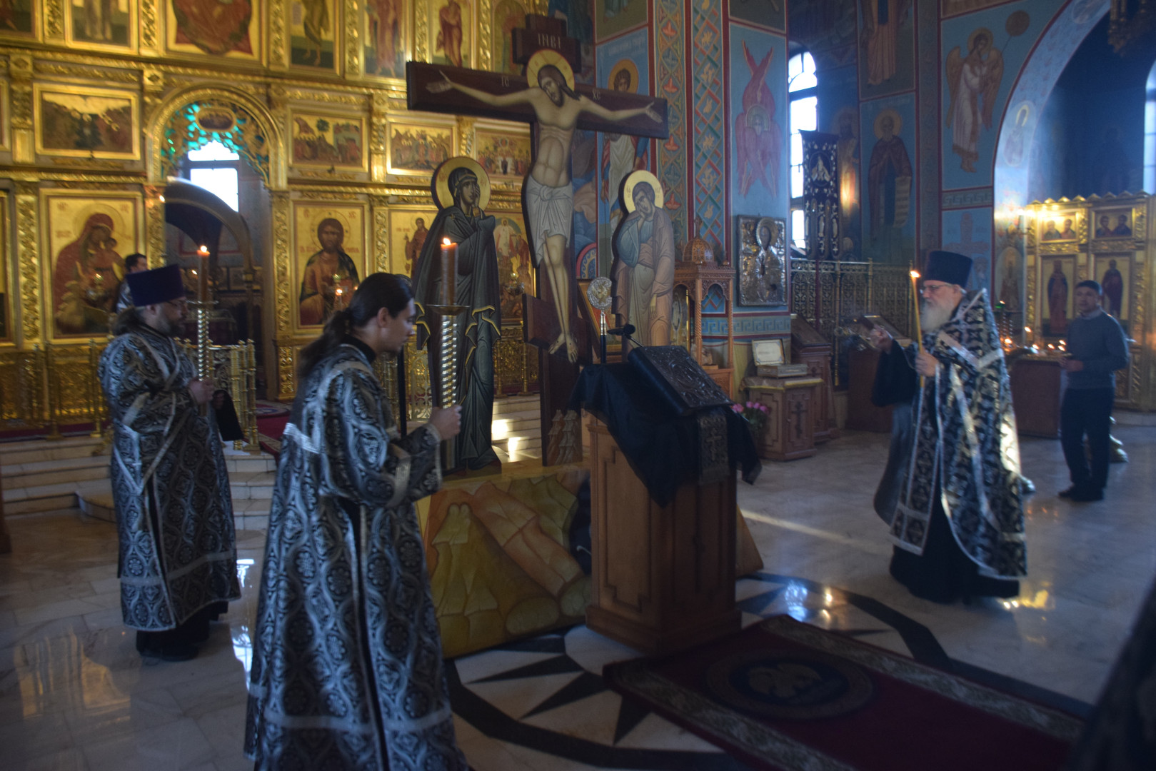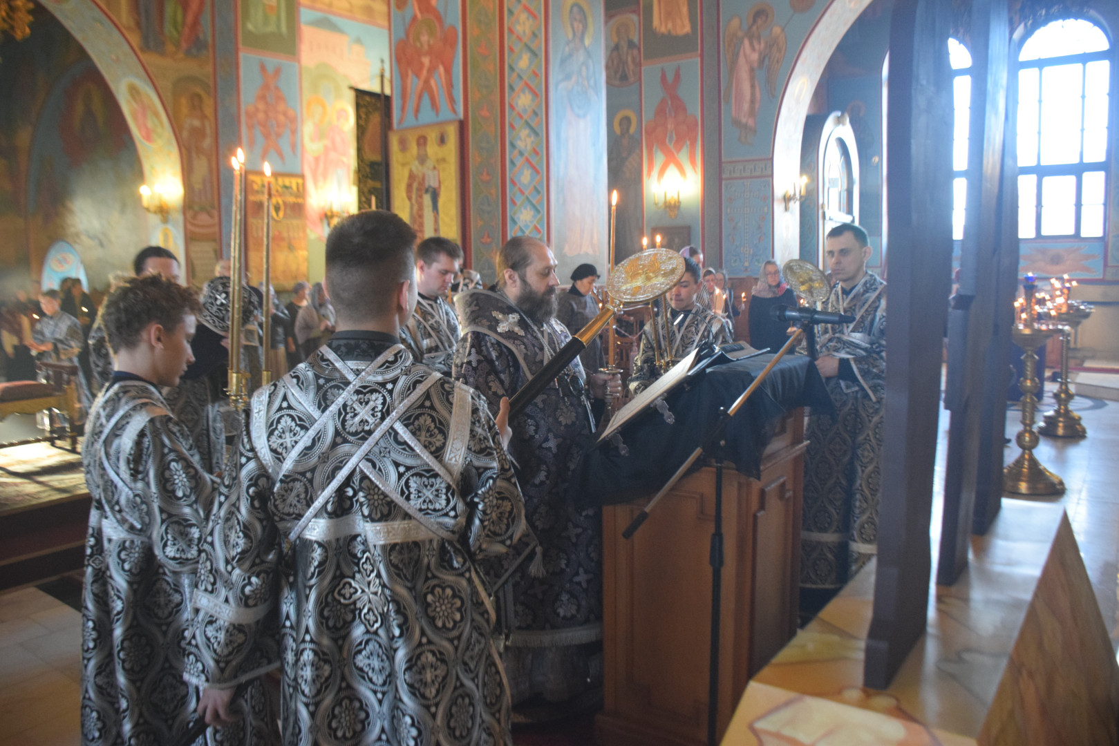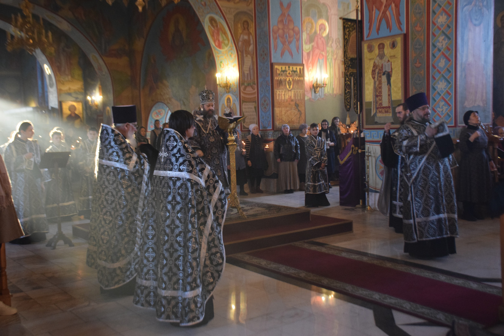 Вечером 9 апреля 2026 года, накануне Великой Пятницы, дня Распятия Господня, Преосвященный архиепископ Абаканский и Хакасский Ионафан в сослужении соборного духовенства и при молитвенном пении архиерейского хора совершил в Спасо-Преображенском кафедральном соборе Последование святых и спасительных Страстей Господа нашего Иисуса Христа — утреню с чтением двенадцати Страстных Евангелий.